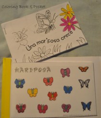 I updated a couple of Butterfly printables, and put into Spanish, so they will not need to be translated. I included a Dot-to-Dot, an Addition-coloring page, a copy of the butterfly on the front and a couple other butterfly coloring pages. I added a couple of writing pages that I got from HomeSchoolShare.com. She can use these to practice writing, or even write a letter if she would like to.