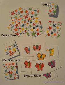 On the inside I added a pocket that holds a little 8 page coloring booklet on the Cycle of the Butterfly. I got this printout from Scholastic printables for free. I colored a little bit of the front cover to personize it for Alisson. I added a second pocket to hold a Butterfly Matching Game, depending on how many matching pieces you include you may want to use a larger pocket to hold them. I created the Butterfly Matching Game and printed them in color on card stock, and glued them to Scrapbook paper to make them more create. I used a little piece of scrap scrapbooking paper to wrap around the cards to hold them into smaller groups while shipping.