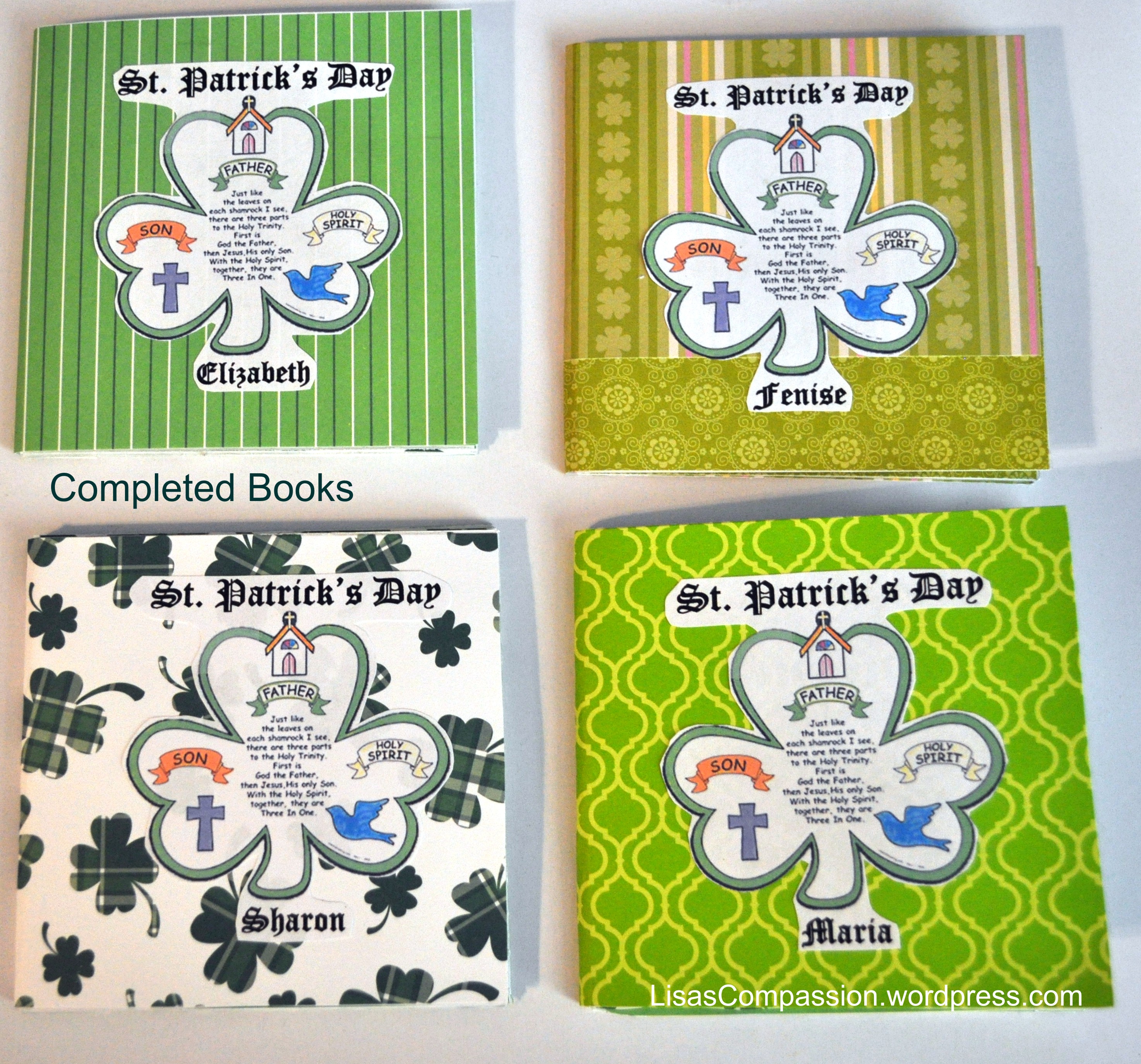 The front has “St. Patrick’s Day” and their name. On the back it has “Made Especially for:” and “Made by” with our Compassion information. These are great for Boys or Girls.