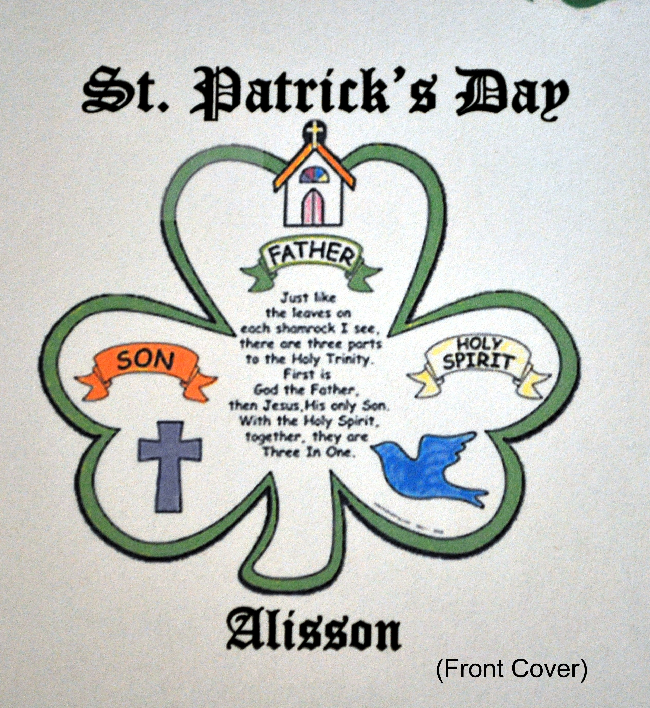 Inside are Bible Verses that I found related to St. Patrick’s Day. I used BibleGateway to look up the verses, and used the Spanish Bible for my Spanish Children. This way they will not have to be Translated. A couple of my Correspondence children I have not received a letter, so I am not completely sure what language they speak/write. I left room so they could be translated. I printed some images from a software program I have, to cut and put on the pages for more decoration.