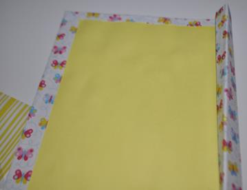 Step 2: Turn the scrapbook paper facedown, and cut the sheet to cover the thicker paper with extra to fold over the edges. The amount you fold over will depend on how you want it to look. I used about 1″ border folded back; it gives it a nice edge inside. Then glue the scrapbook paper to the thicker paper.