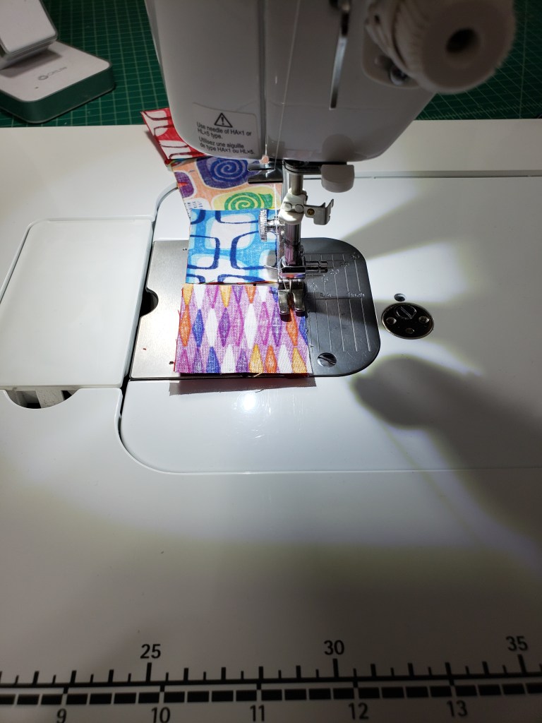 Make the 10 HST by combining one red square to one colored square, sew a scant 1/4″ from the line on both sides of the line. After sewing cut down the drawn line.
