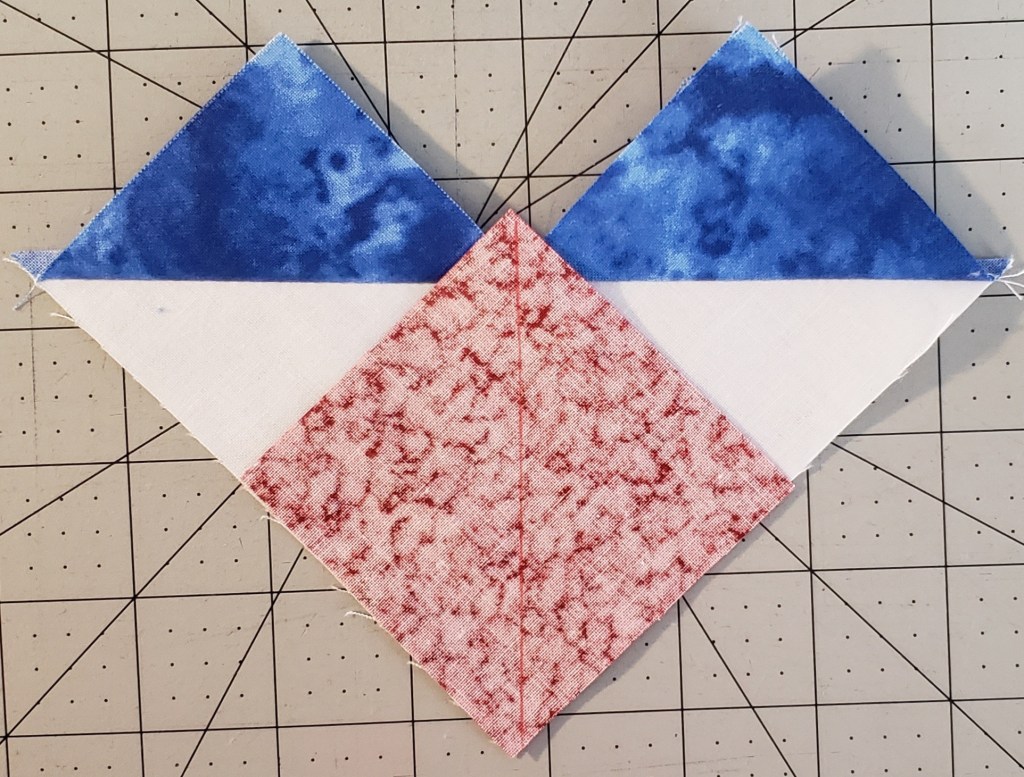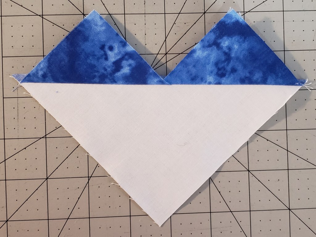 Sew the right triangle to the center, and press seams towards the background (white).