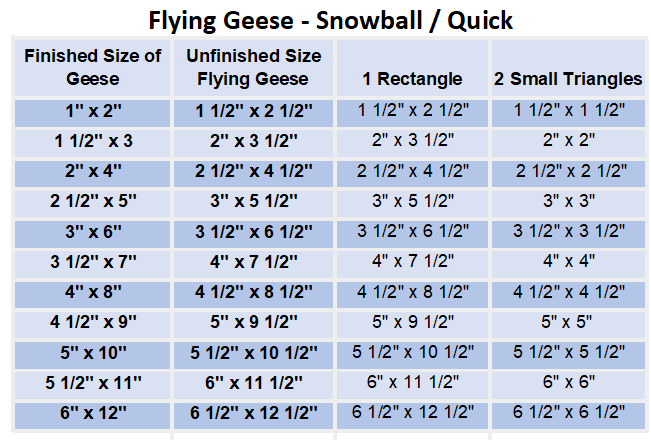Flying Geese are normally twice as long as they are tall. Here are some charts for No Waste, Snowballing and Singles.