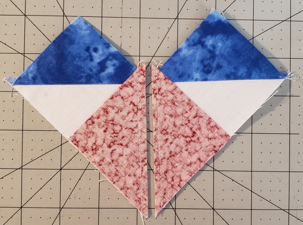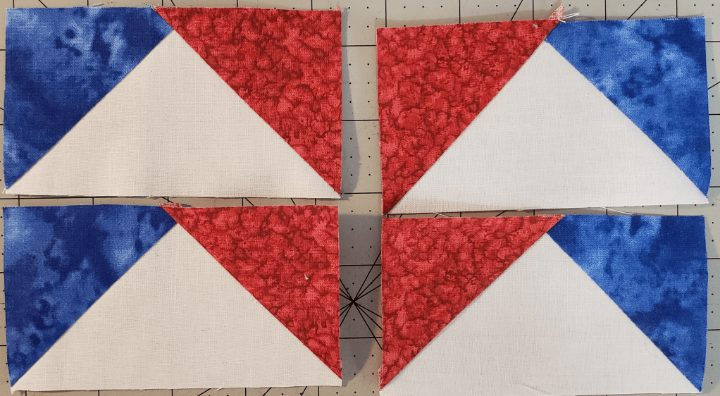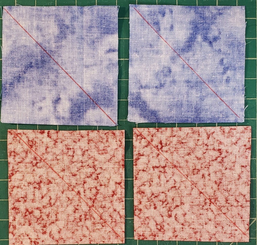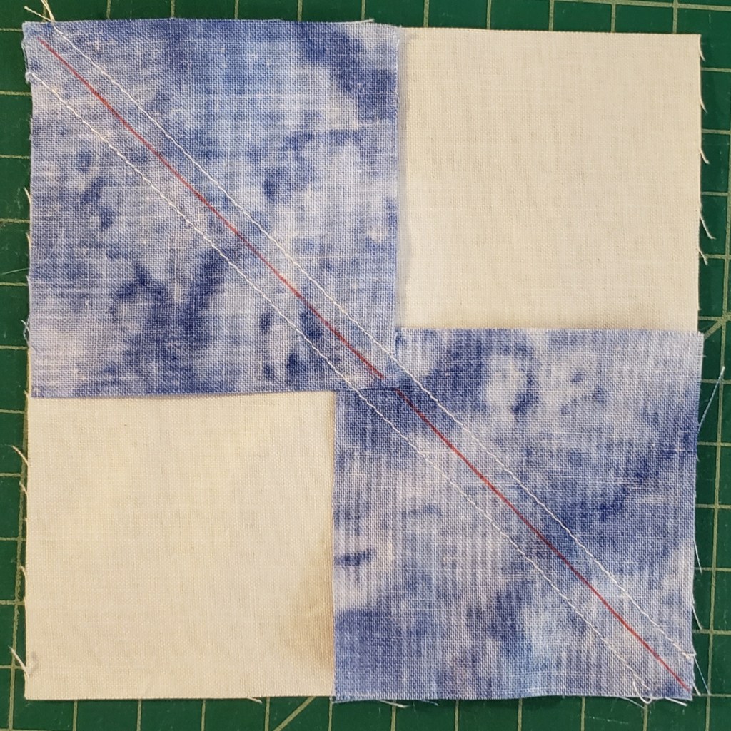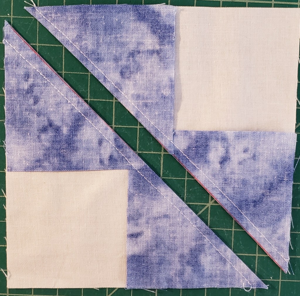 NOTE: an option is to sew a second line to the outside of the sew lines, before cutting, 1/2″ and then cut between the two sewn lines, to create some “bonus” HST.