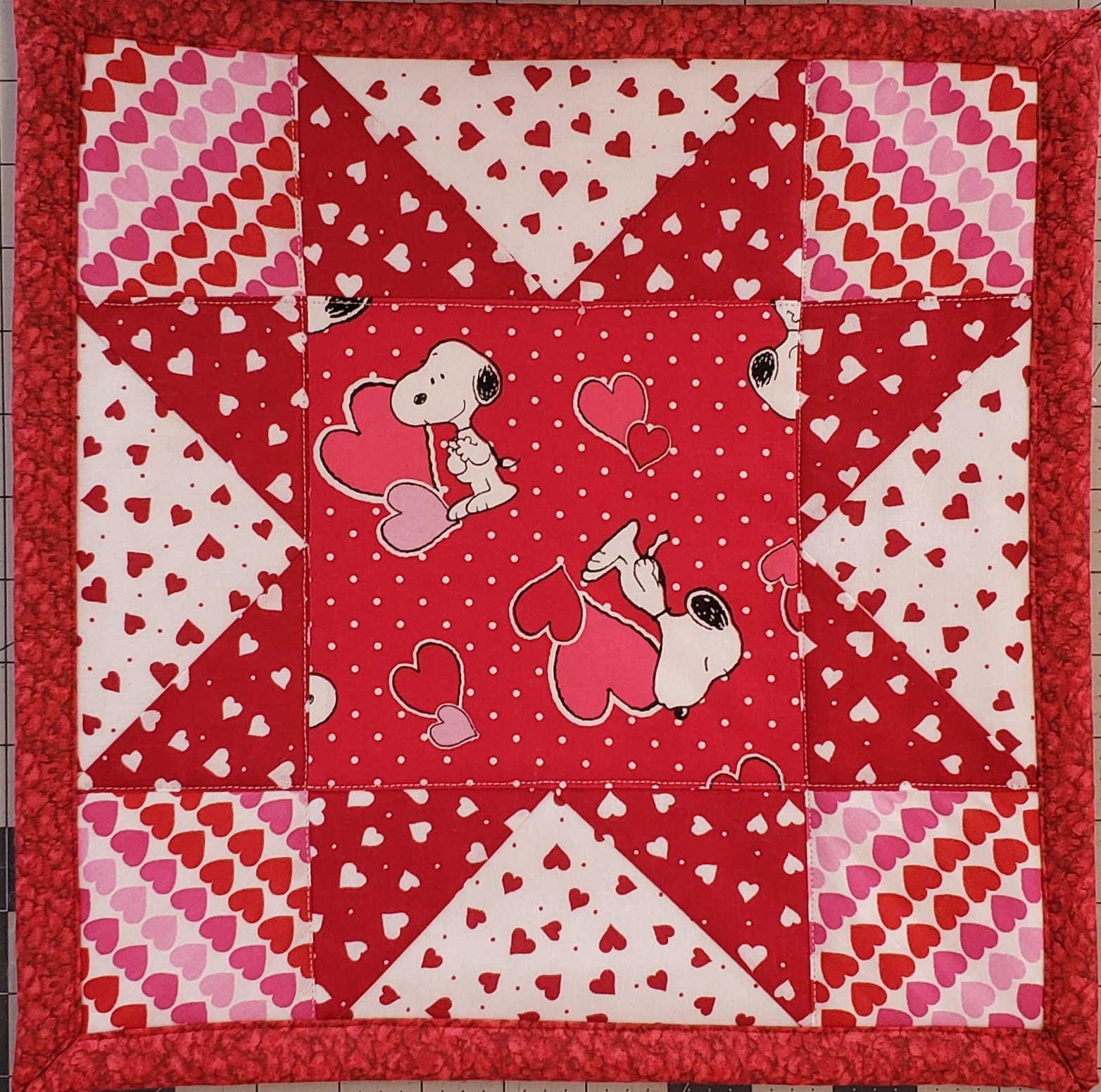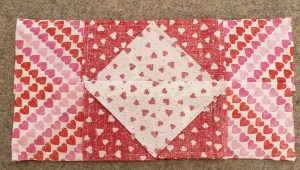 The block will finish at 12″ x 12″ (12 1/2″ x 12 1/2″ unfinished). The block will use the No-waste flying geese method. A quick and easy way to make four flying geese. I decided to use valentines fabric, and used some Snoopy fabric for the center block. I fussy cut the hearts for the corners to give it a more fun look.
