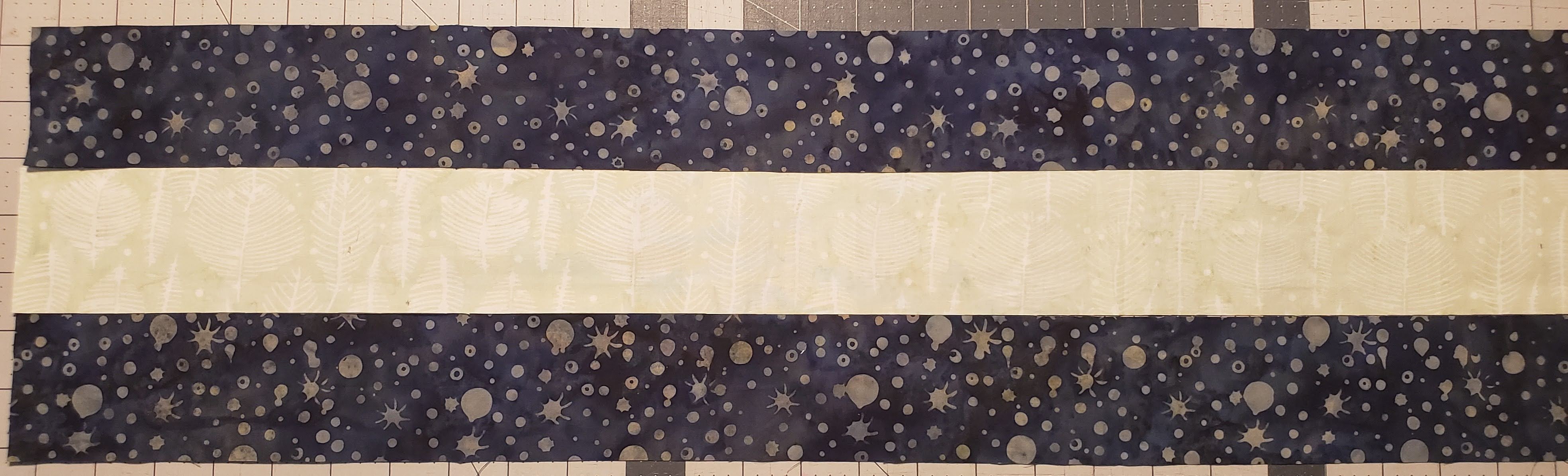 • Cut strips of 2 1/2″ x 6 1/2″ (the three pieces strips) from each of the three sets of strips (as you will have different lengths, you will have extra at the end.  Set those aside