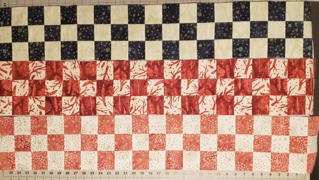 • Create two different sets of 9 patch – Alternating between the two sets of strips, layout the pieces. Sew them in groups of three to create a nine-patch block, and then sew the alternating 9-patch block together.  You will have 4 of one 9-patch and 3 of the alternating 9-patch.  Sew the row together.  Each set will measure 6 1/2″ x 6 1/2″