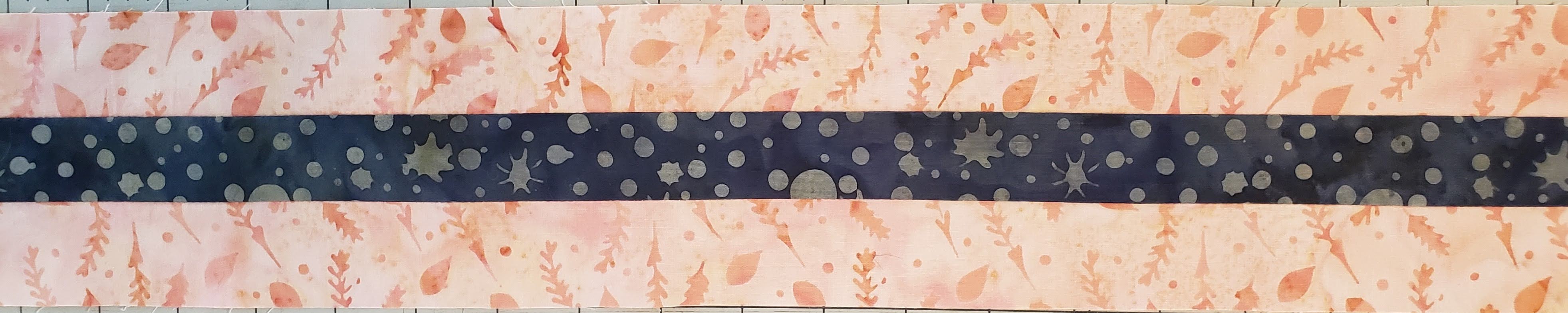 Using the three 1 1/2″ x WOF strips, lay them alternating between the two colors.