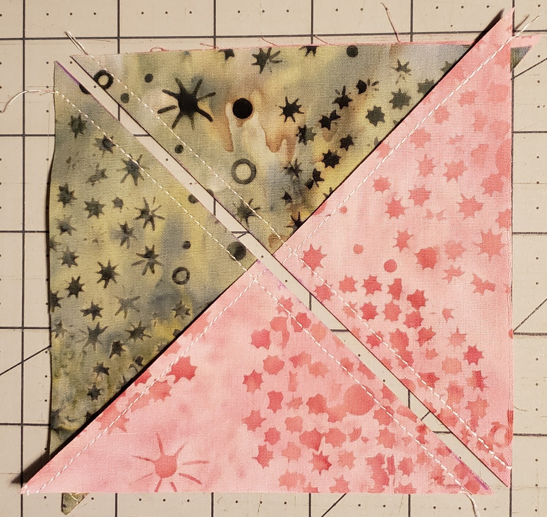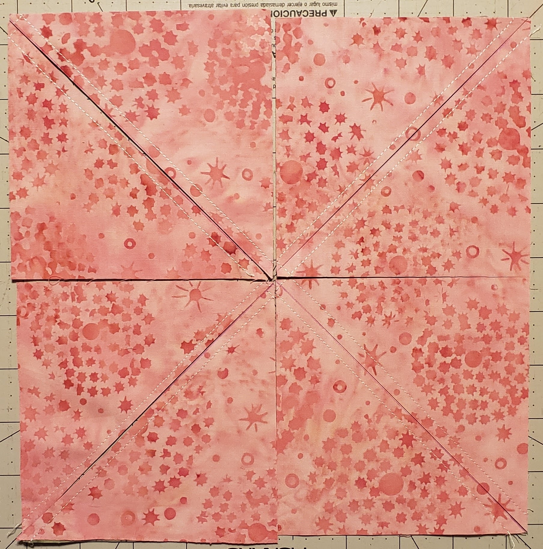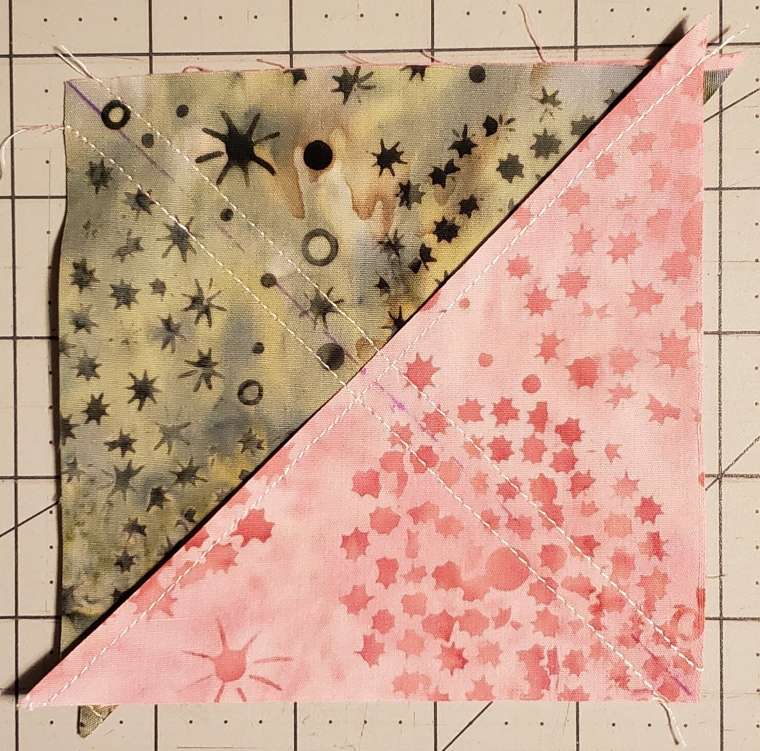 One the lighter of the two fabrics, draw a line from corner to corner.