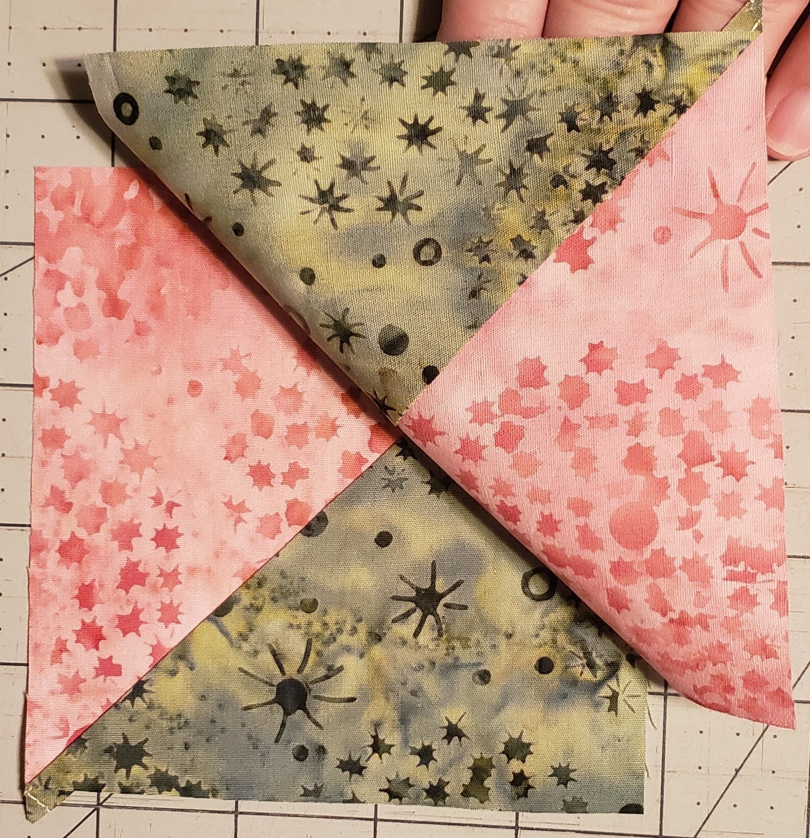 Using two HST lay them so that the Green is right side to the pink, like this.