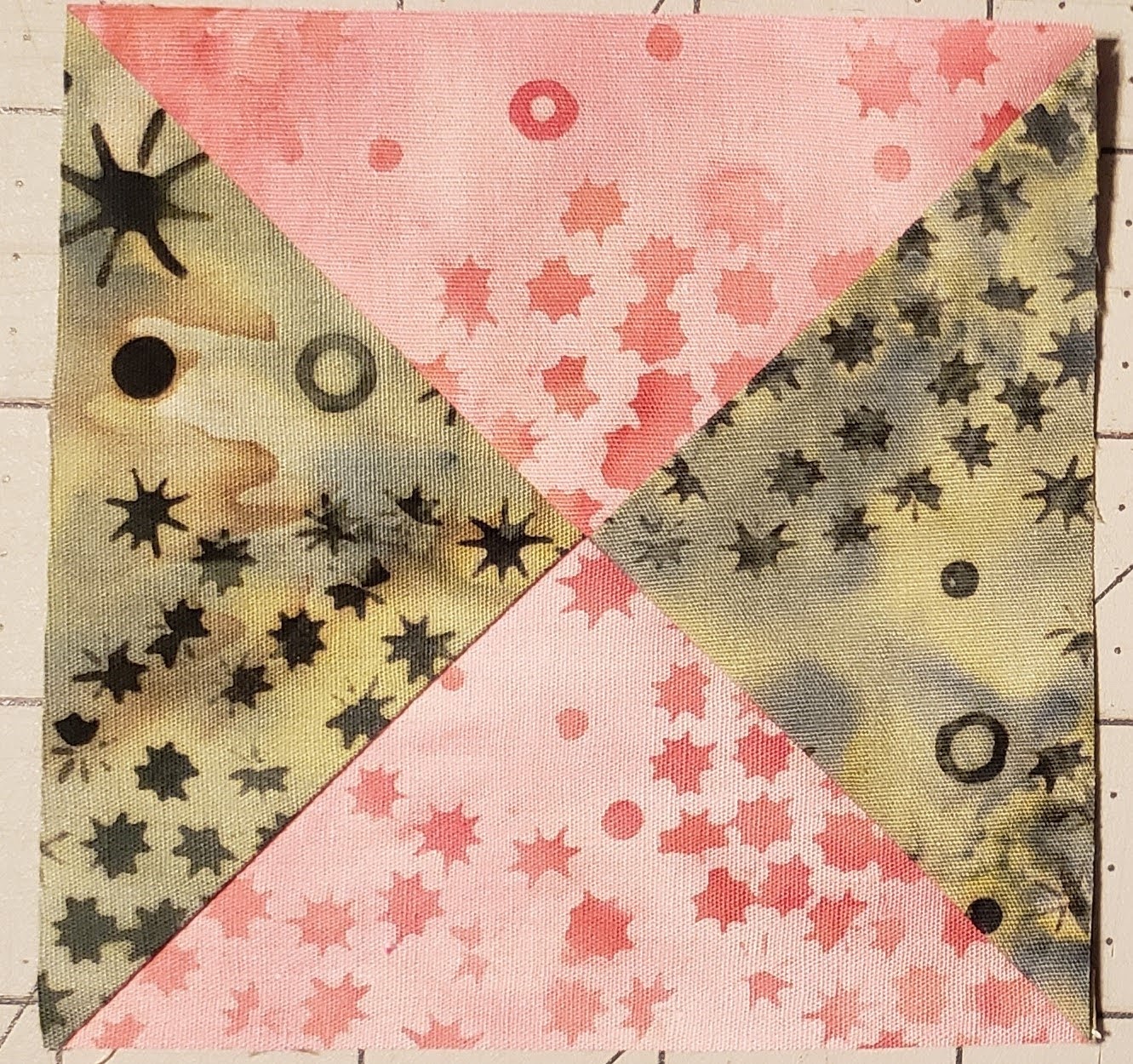 - Place two Color A on opposite corners of Background, right sides together, with the lines flowing together.