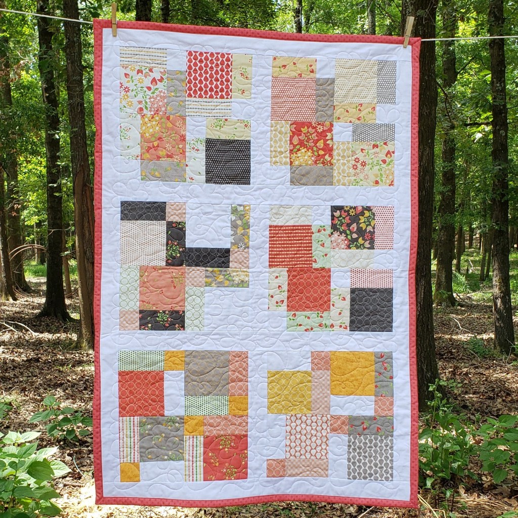 The back was some other fabric I had on hand that I felt matched the charm pack, and I used a self-binding method. After I had quilted the quilt, I cut the back 2″ wider than the front, I trimmed the batting to 1″ wider than the top, and then folded the back fabric in half, and then in half to the front, then stitched with my Juki sewing machine. It is so much easier to do this type of binding, than to cut and sew, then fold, then sew strips of fabric to bind the quilt.