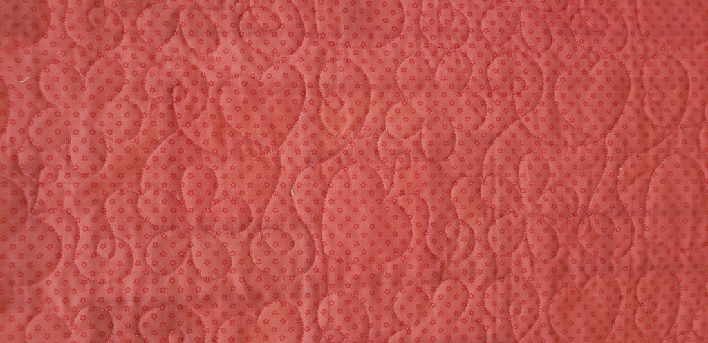 To quilt I used an Designs by JuJu, Edge-to-edge quilt design, Hearts and flowers, that I purchased. (fabric is more pink than the picture shows.)