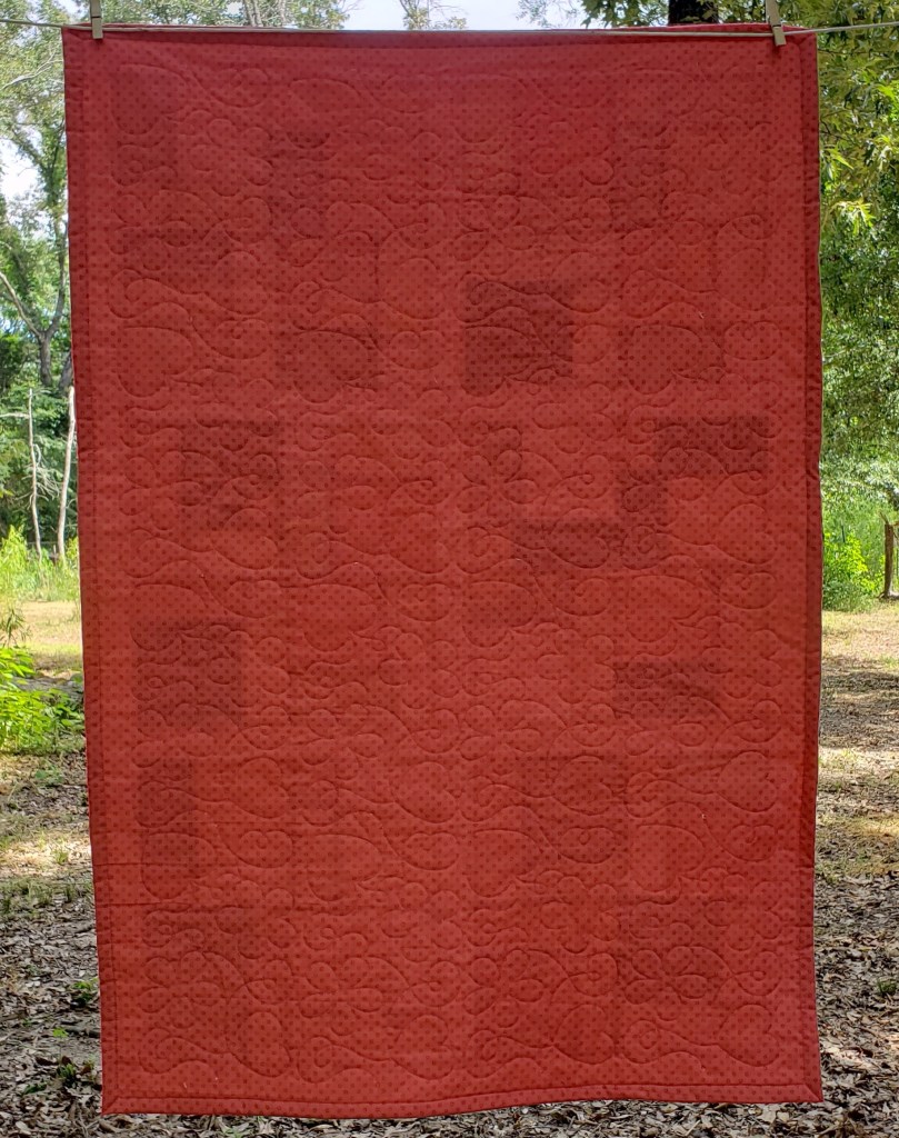 Here is the full back with all the quilting done. (The sun was shinning, so you could see the front design when I took the picture).