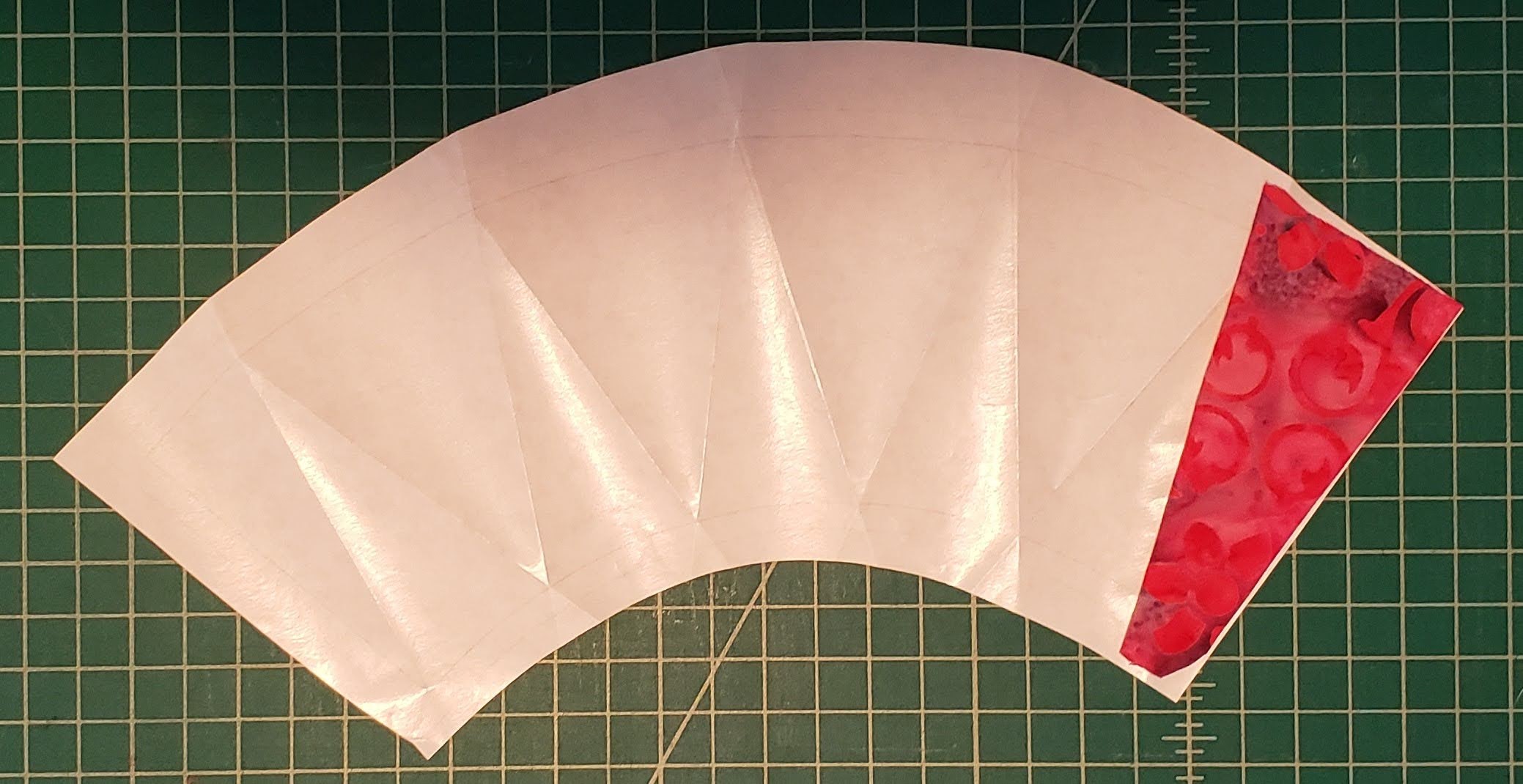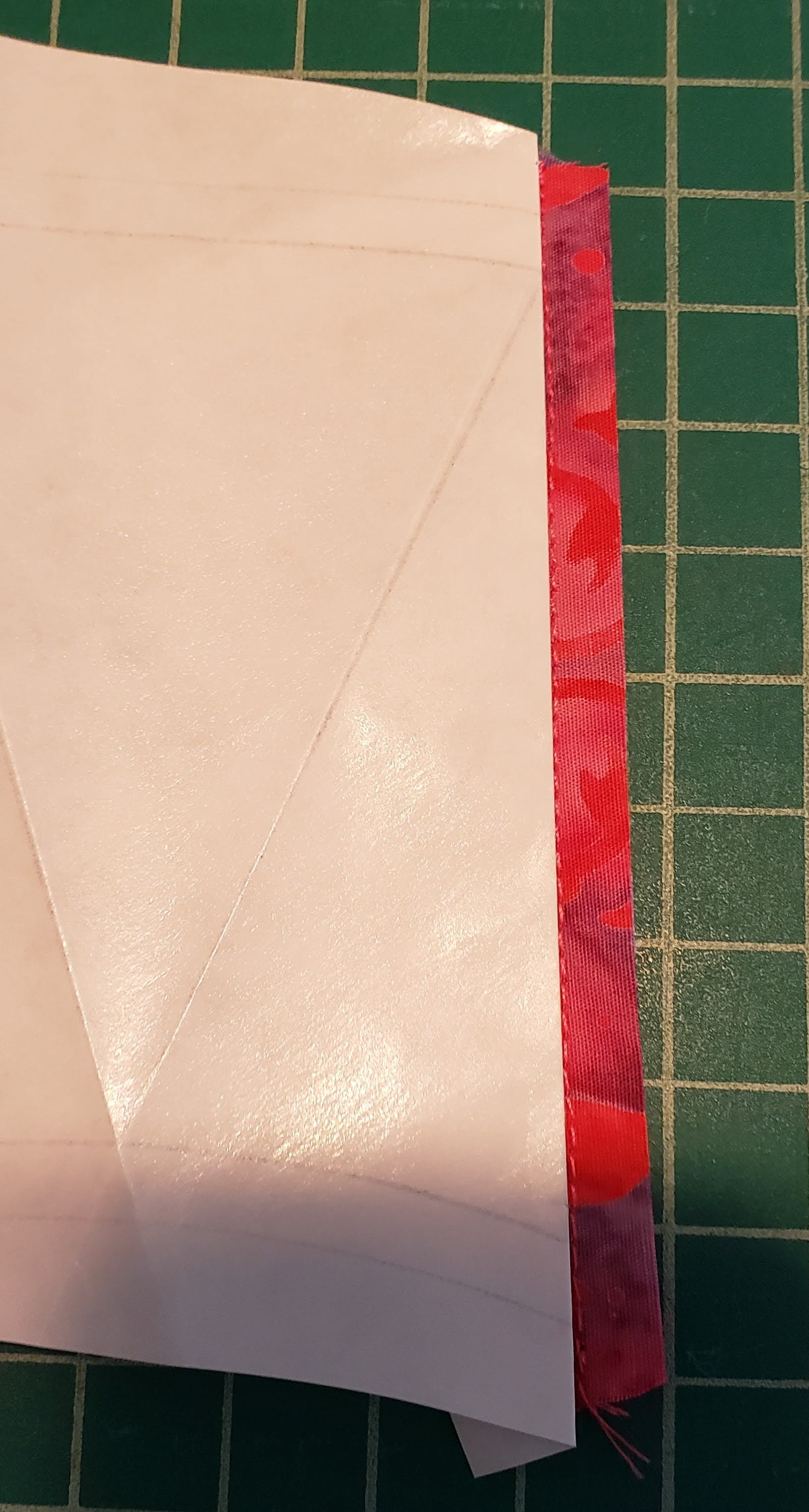 After ironing the fabric to the paper, fold back on the fold line, and trim to 1/4″