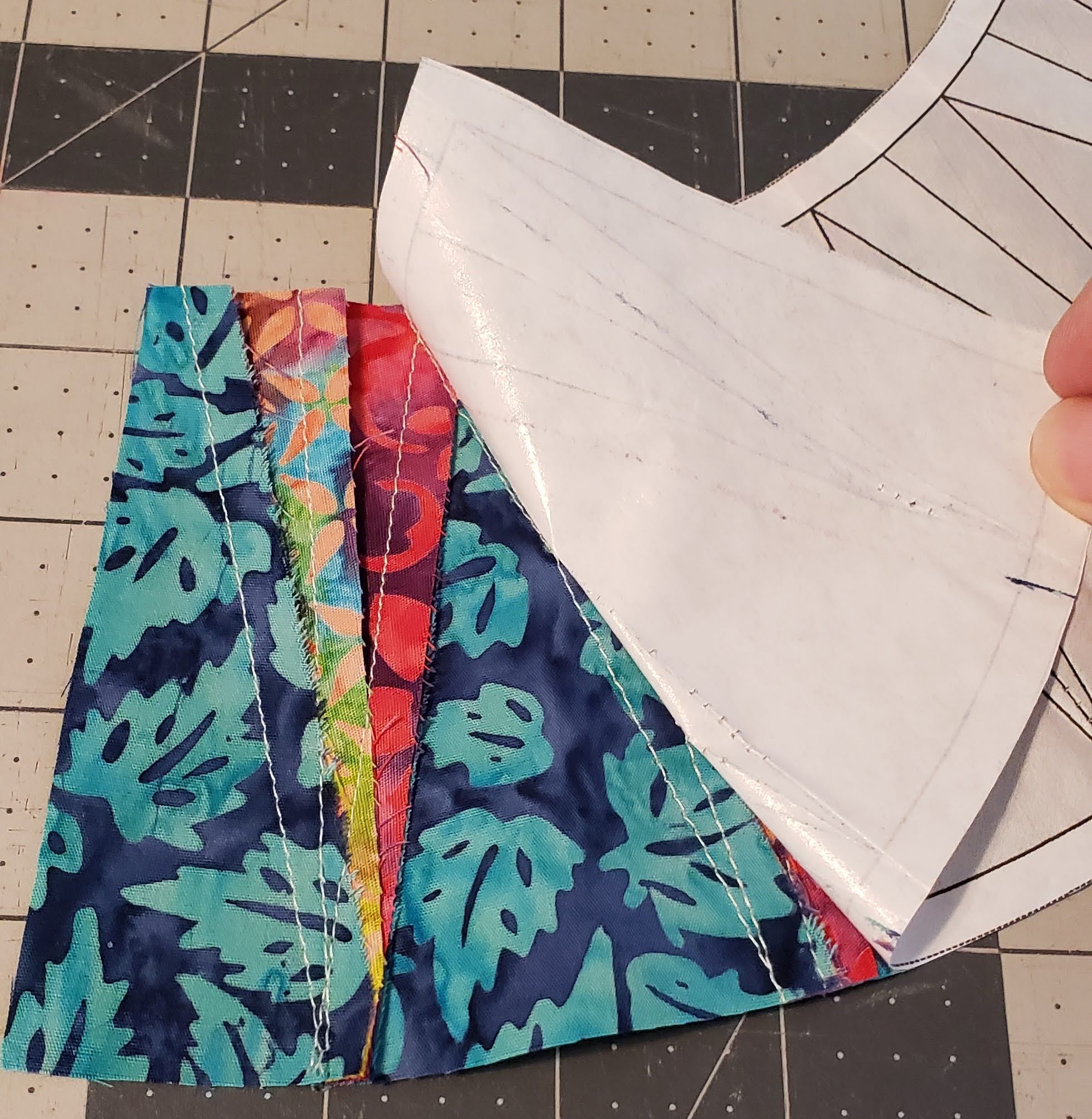 The first piece, you will iron on to the paper piece, with fabric back against the paper. The rest of the pieces will be right sides together.