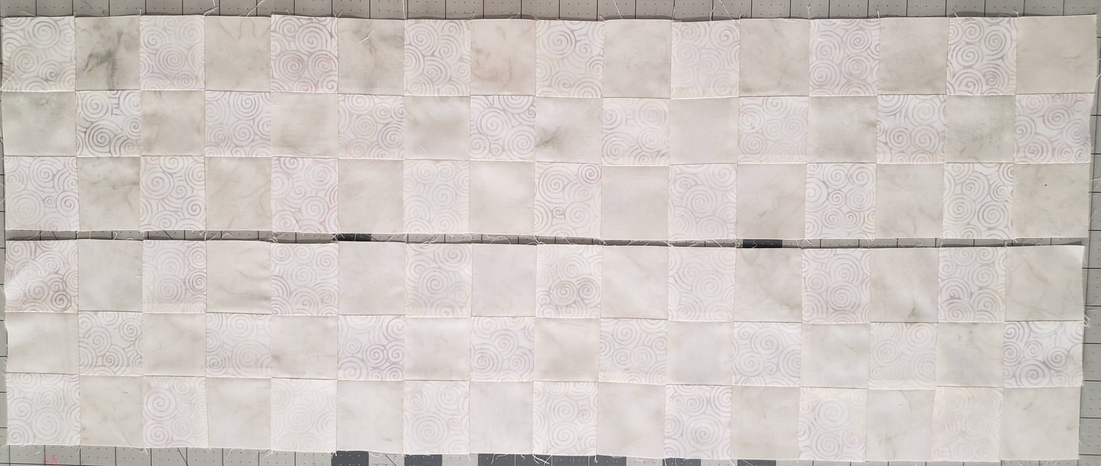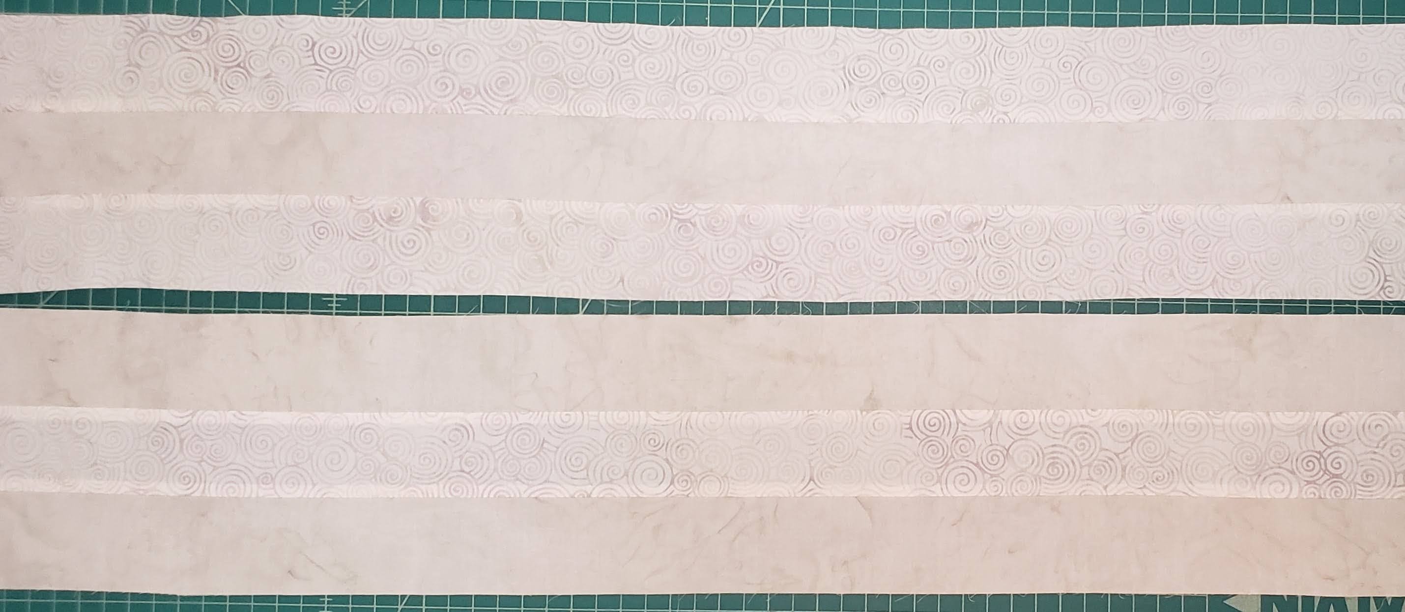 You will need to do this for all 2 1/4″ x WOF strips, 9 from Oster and 9 from Icing.