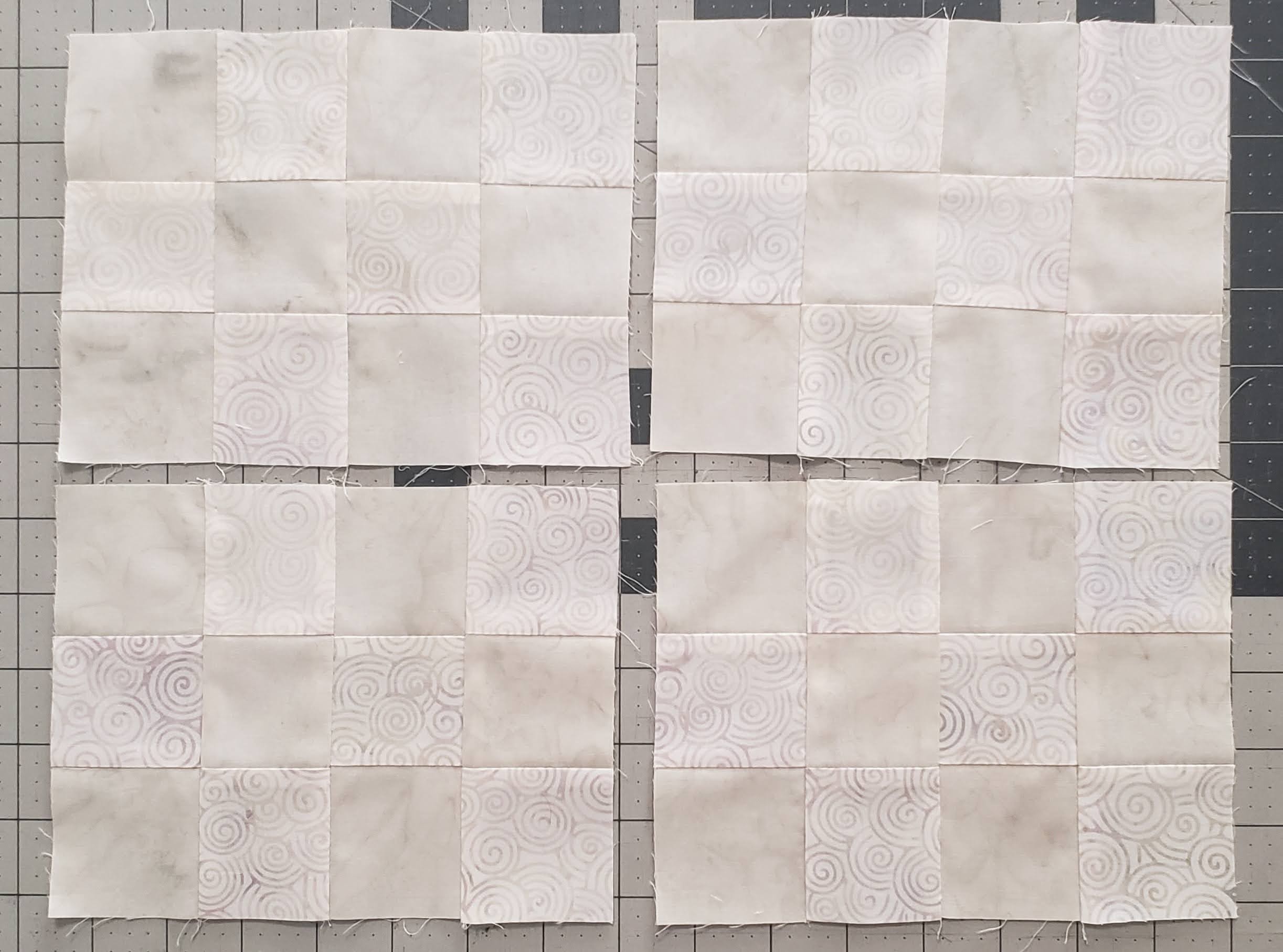 The background was created using the 2 1/4″ strips. I sewed the strips together in sets of three. 2 different sets. You will create 3 of each set.