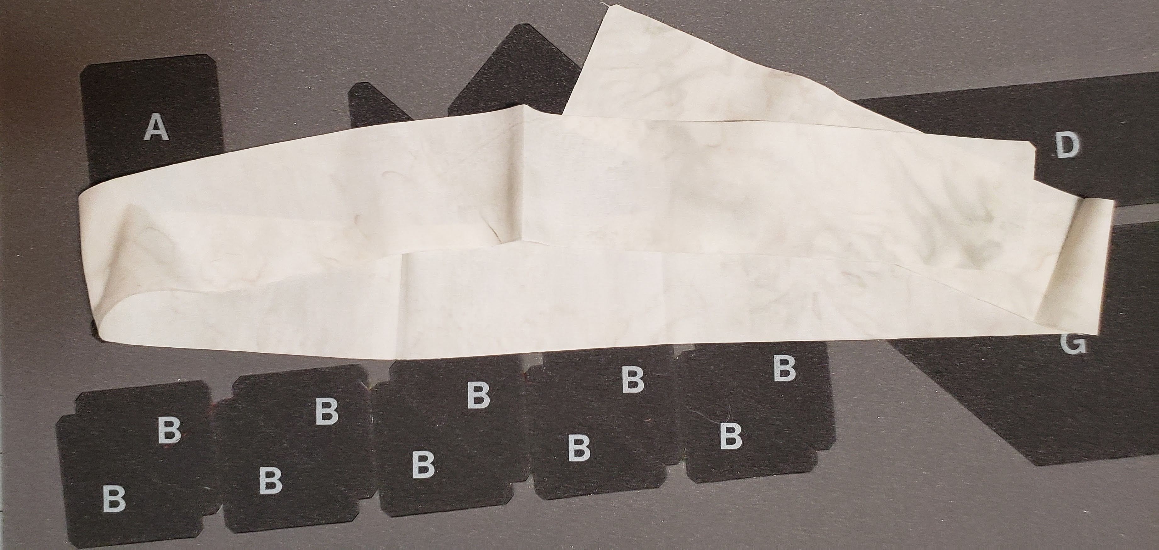Carefully layout the strip along piece D, and then fold back “before” you get to the other end of the strip. You do not want that end to be cut, so you need to fold back before the end.