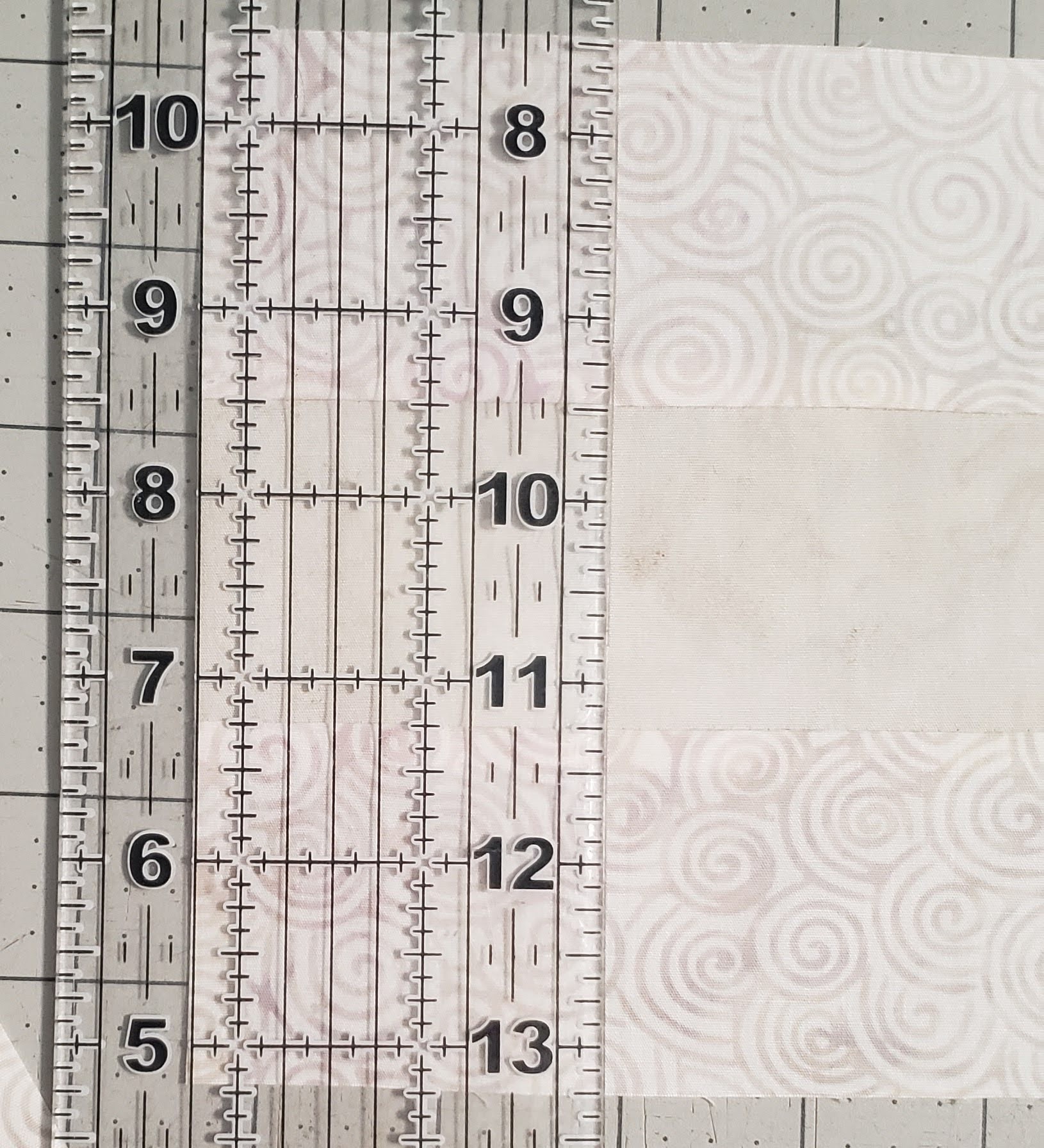Using a ruler with a diagonal line, line the diagonal line down between the 2nd row of seams.