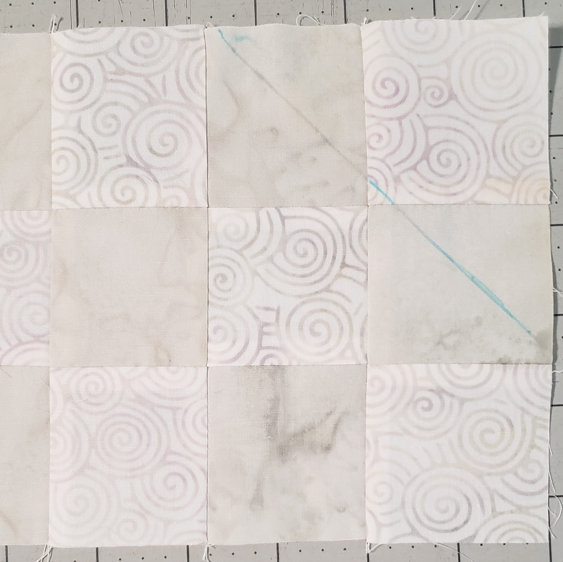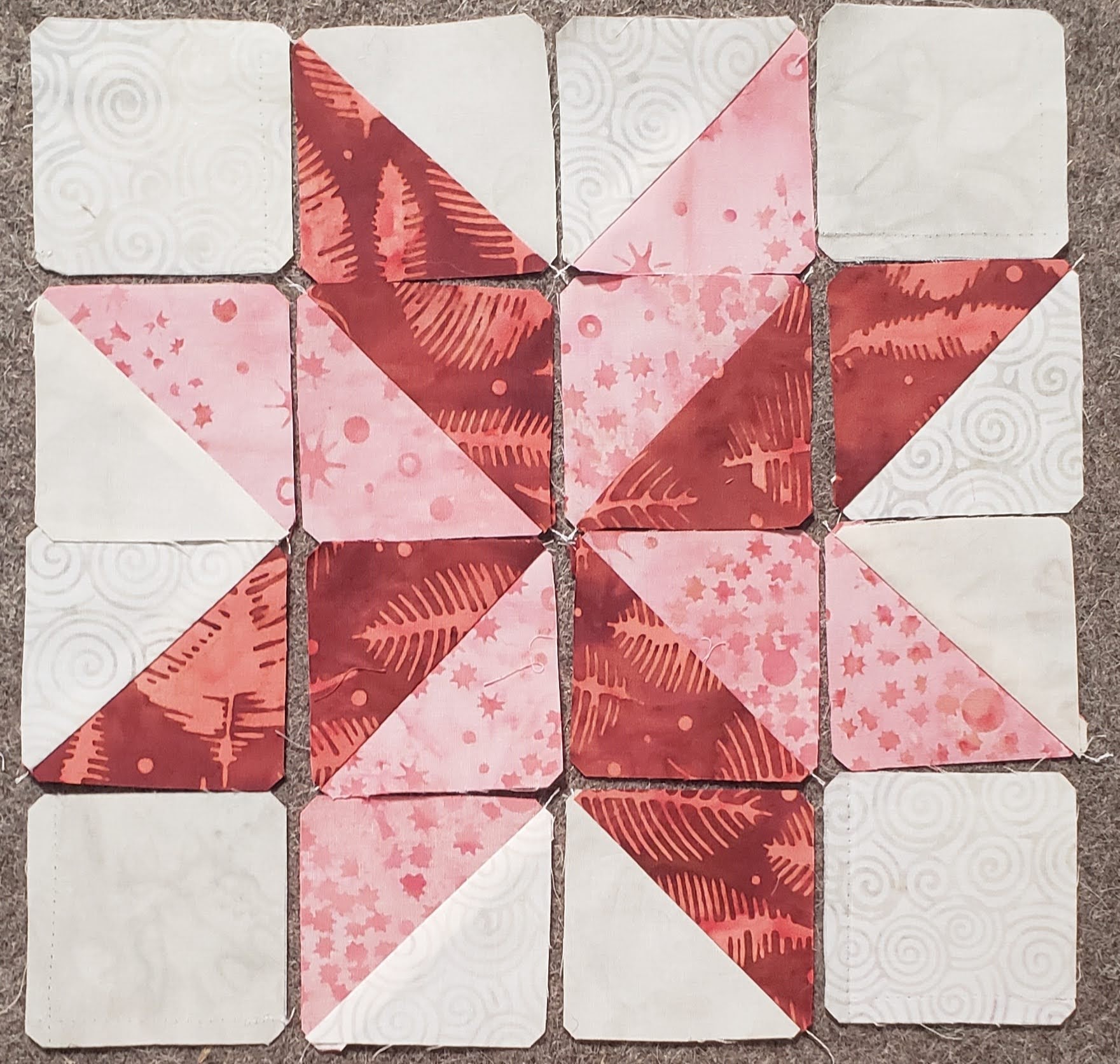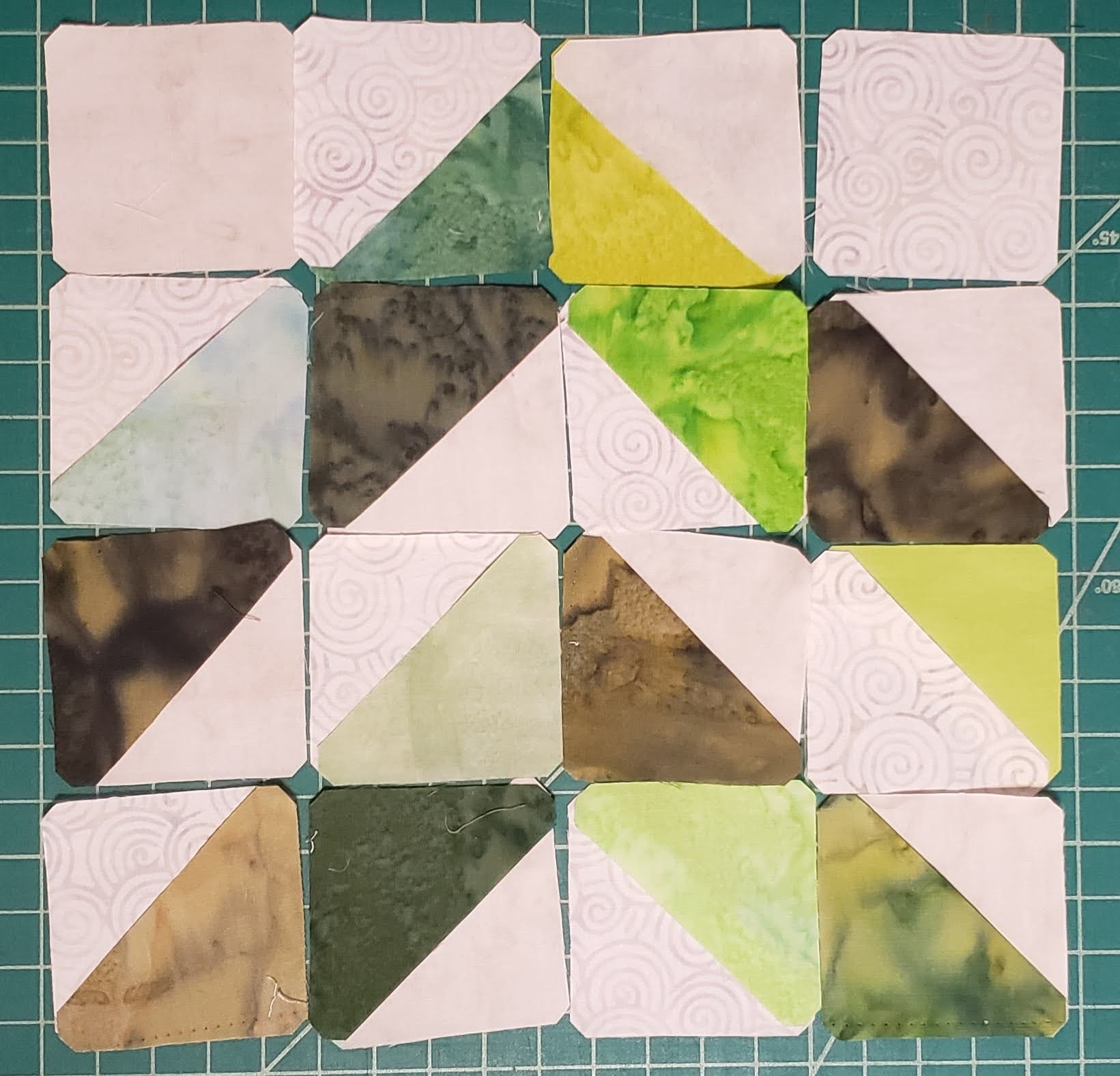 Once happy with your layout, sew the triangles together to create a square, then layout the pieces to make sure you are still happy with the layout, and that your background pieces are going back and forth between Oster and Icing.