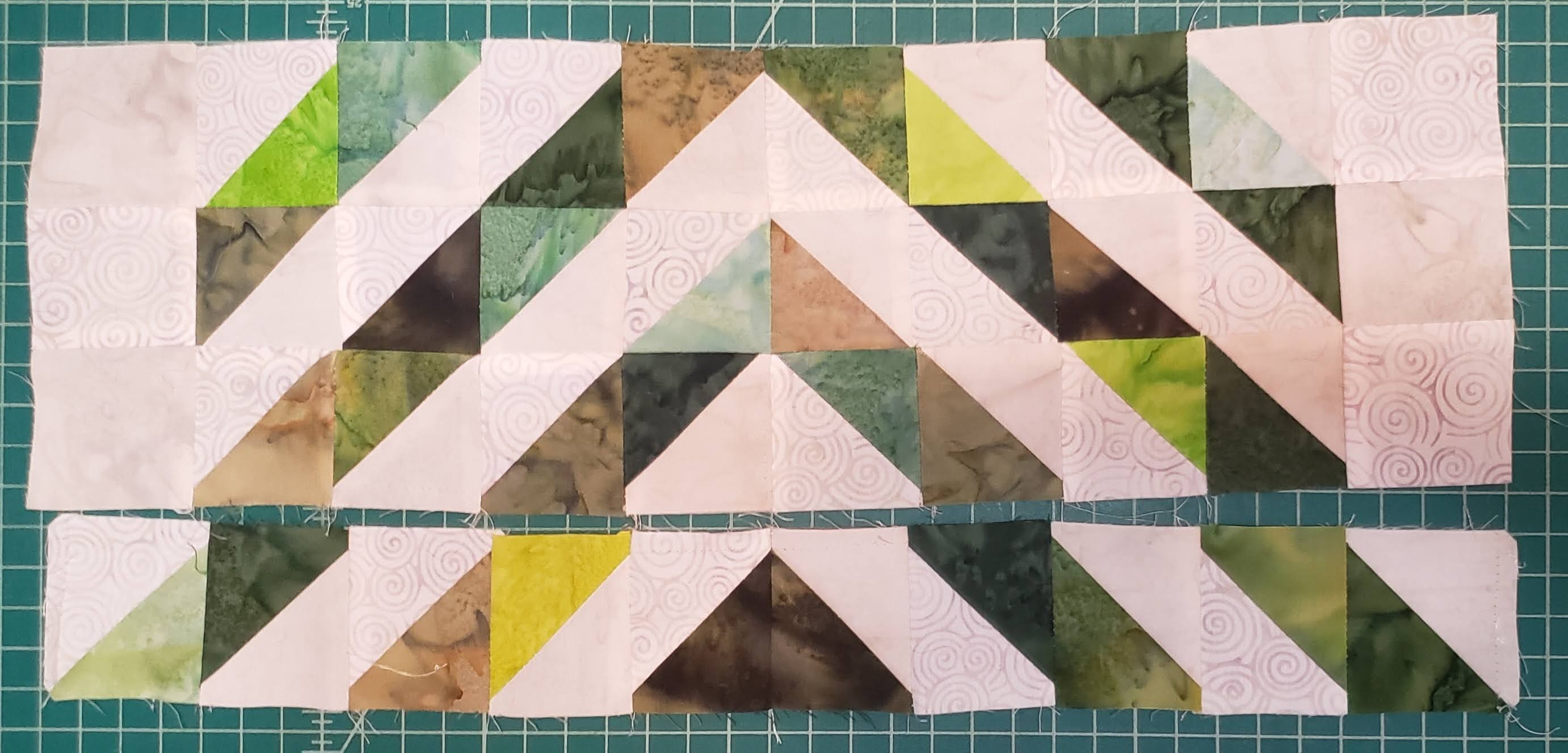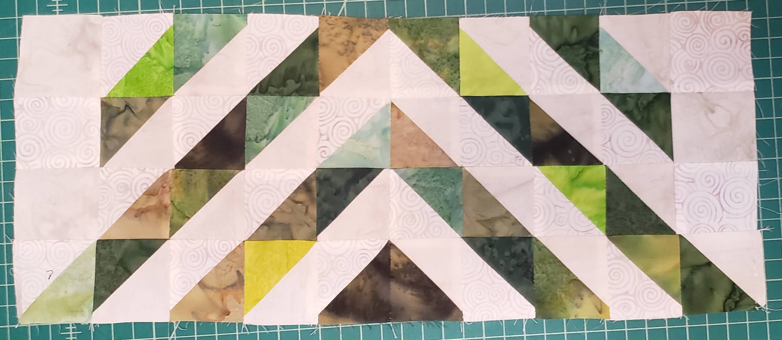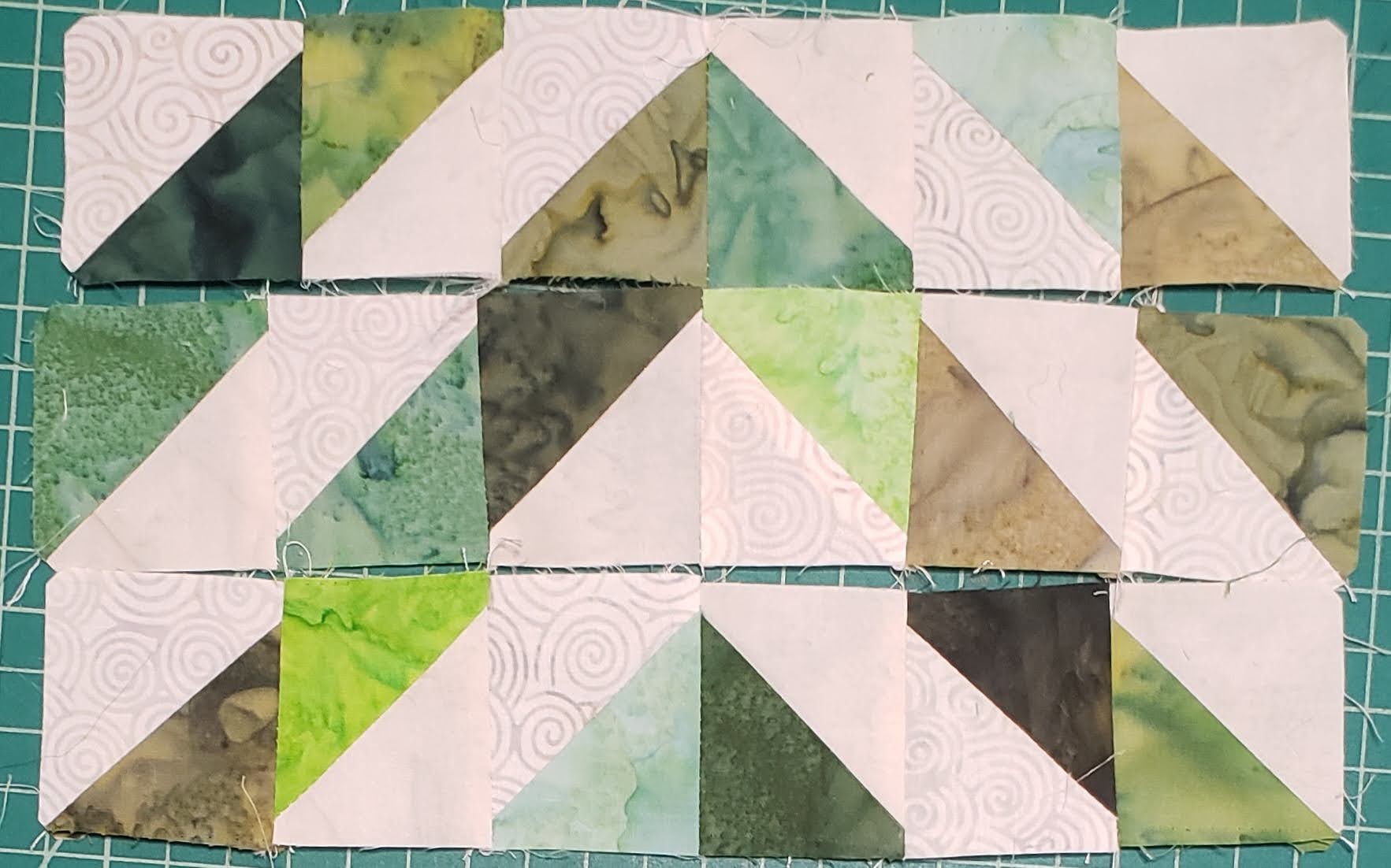 Using all the 2 1/2″ triangle pieces, layout in the following layout, sorting green as you want