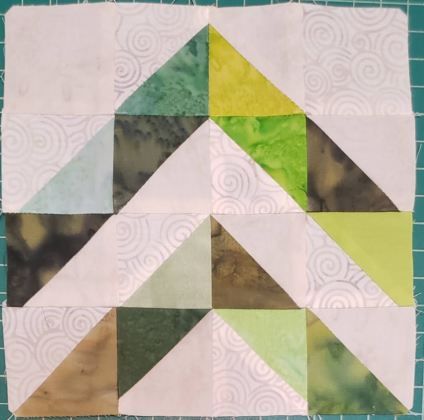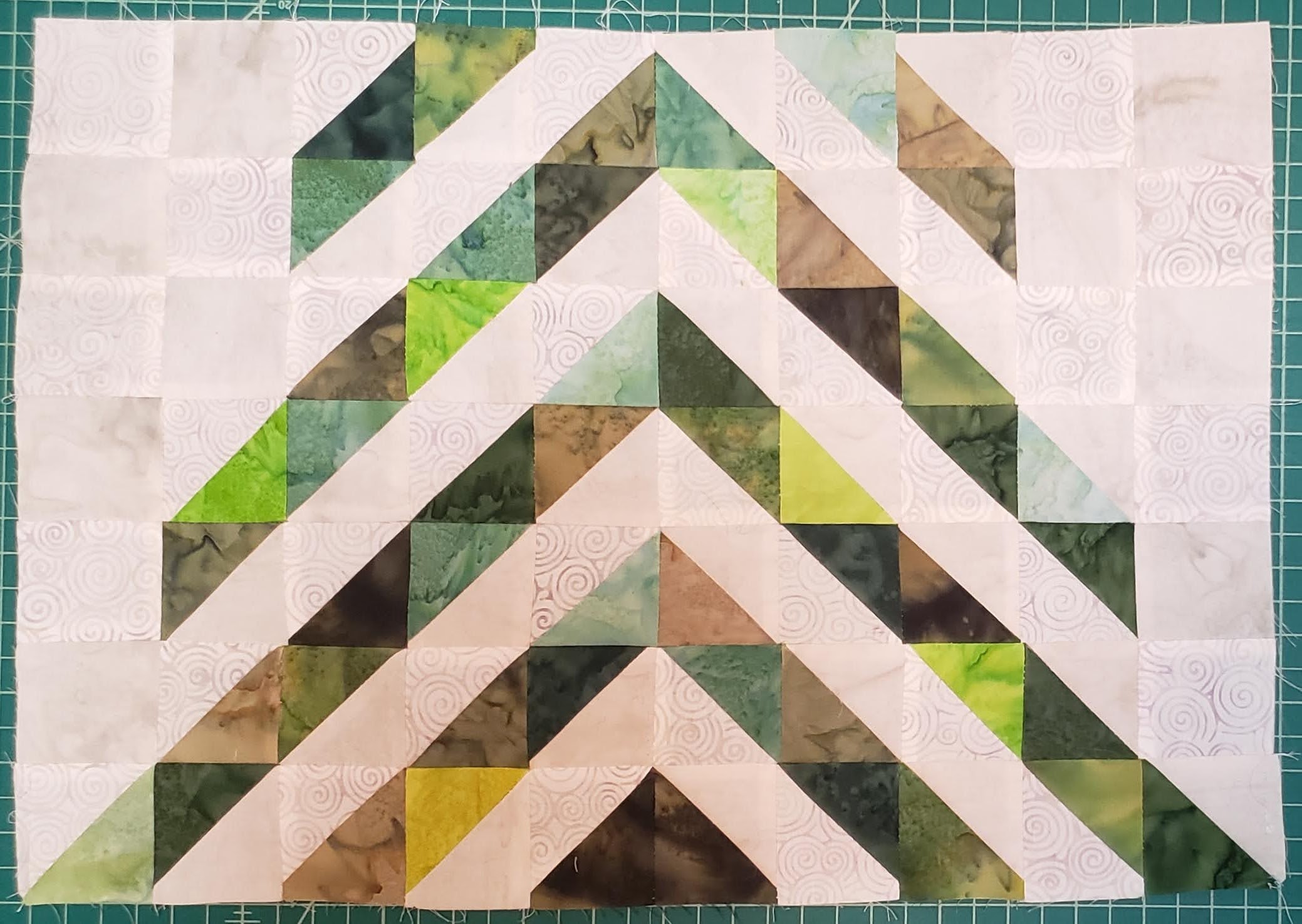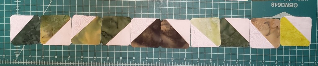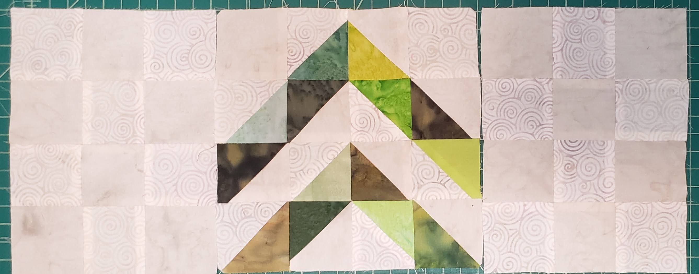 Using all the 2 1/2″ triangle pieces, layout in the following layout, sorting green as you want