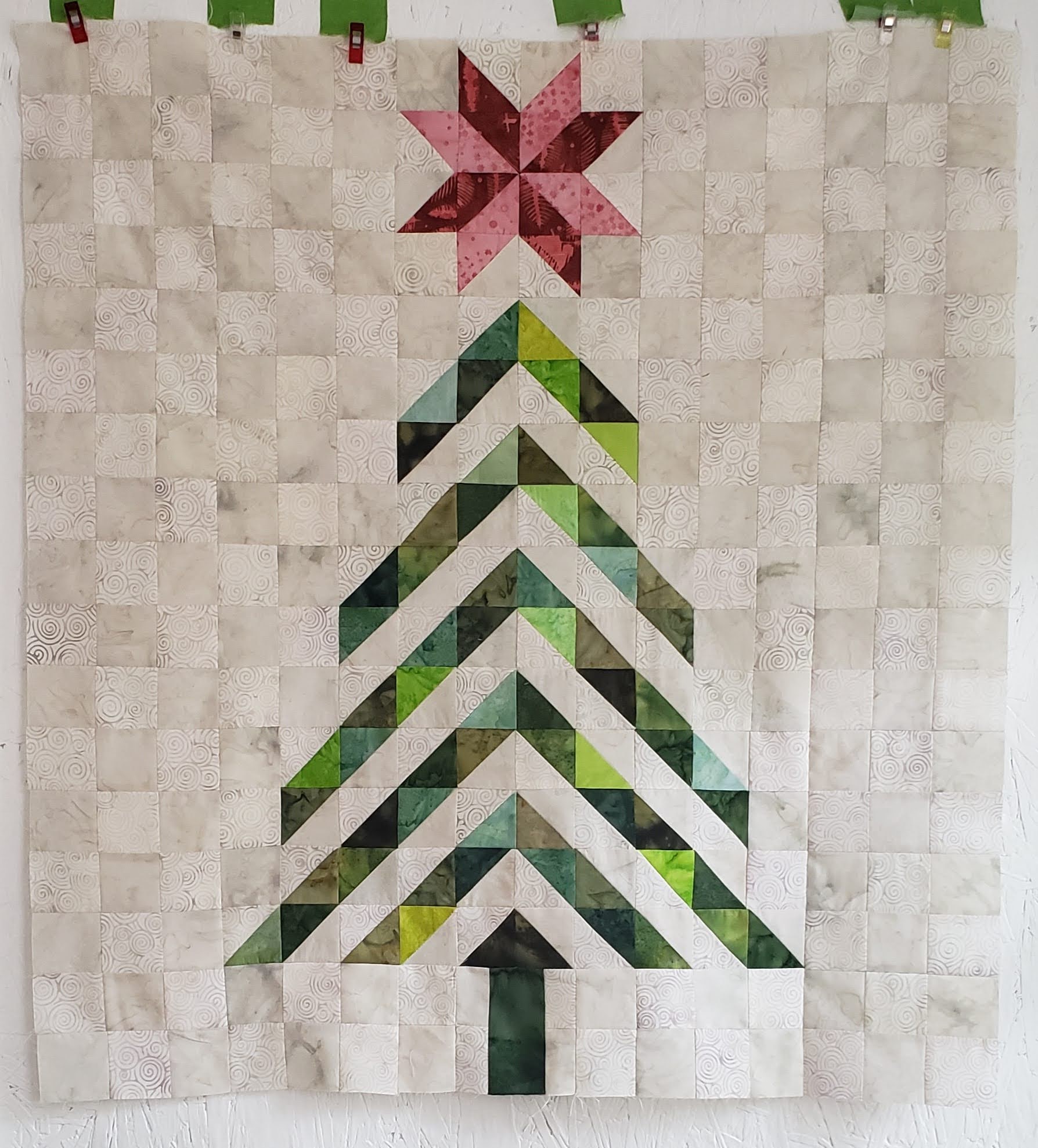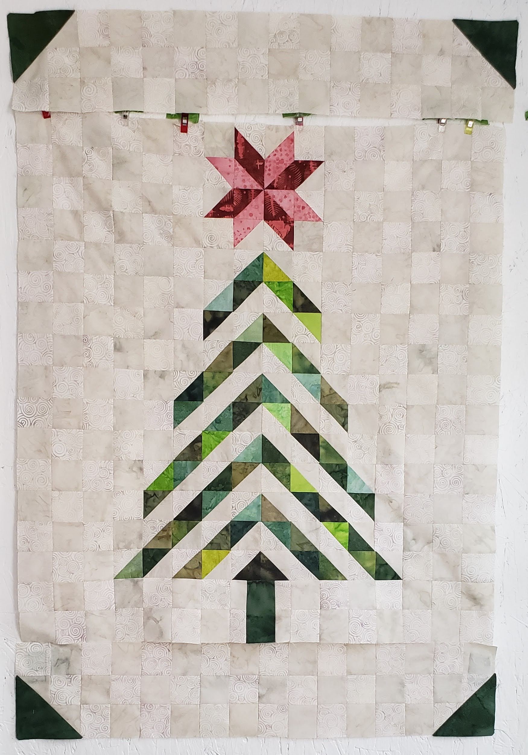 4) Creating the top section of the tree, sew the triangles into squares, and the squares into rows, and rows together.