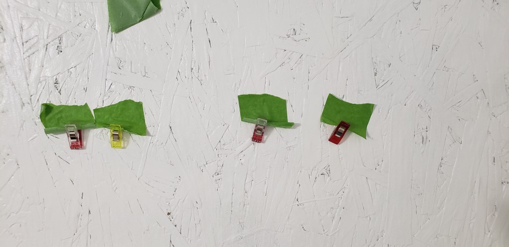 I have been wanting to do something different, so the quilts don’t fall to the floor while I am trying to take a picture. Painter’s tape doesn’t always hold the best when adding a lot of weight, or the clips just pull out. I would stop for the night, and come back in the morning to several of the pieces laying on the floor because the clips pulled out from the tape.