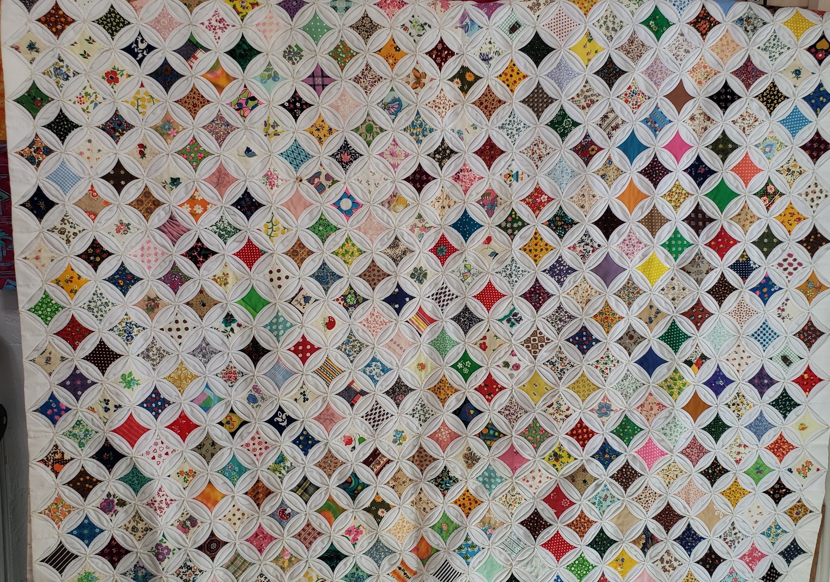 A couple years ago, I received some items from my Mother-in-law Norma, who loved to quilt. One of those items was a partially completed Cathedral Window quilt (90″ x 48″).