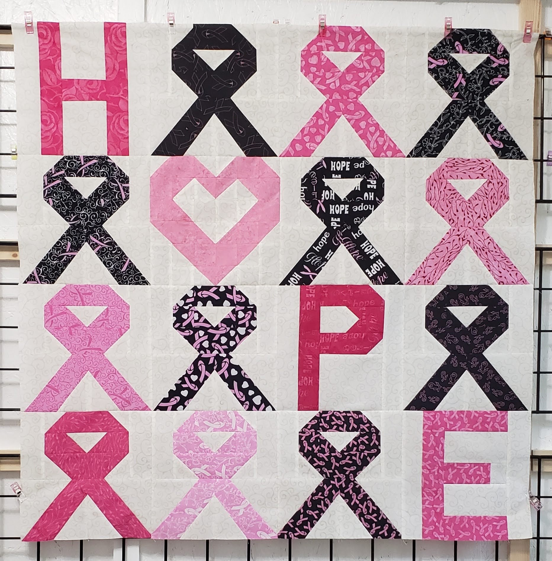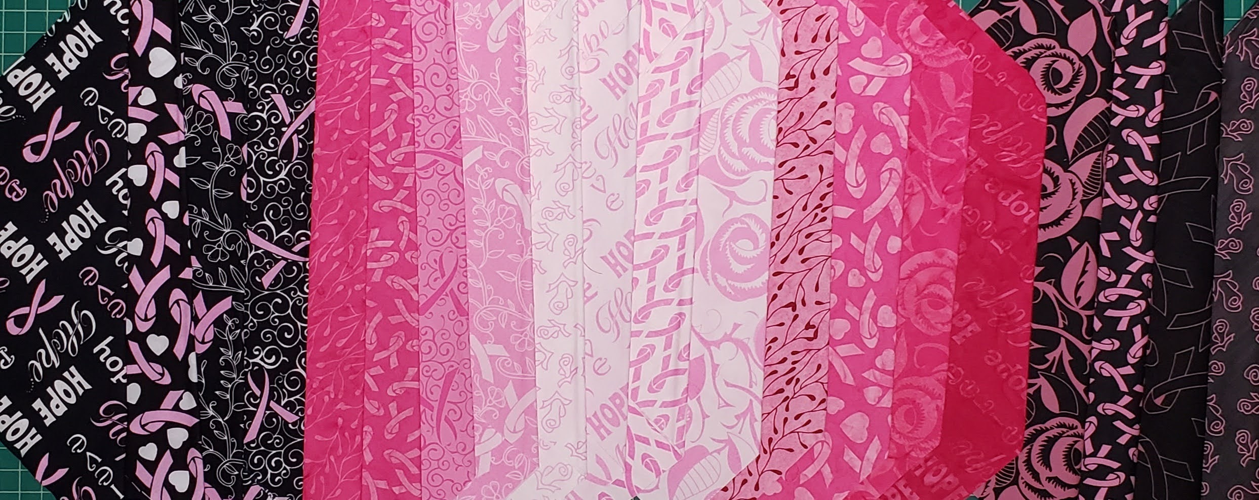 I used my design wall to help pick the fabrics I wanted to use for the letters of Hope and which ones I wanted to use for the Awareness Ribbons. There are 20 different designs in this fabric line.