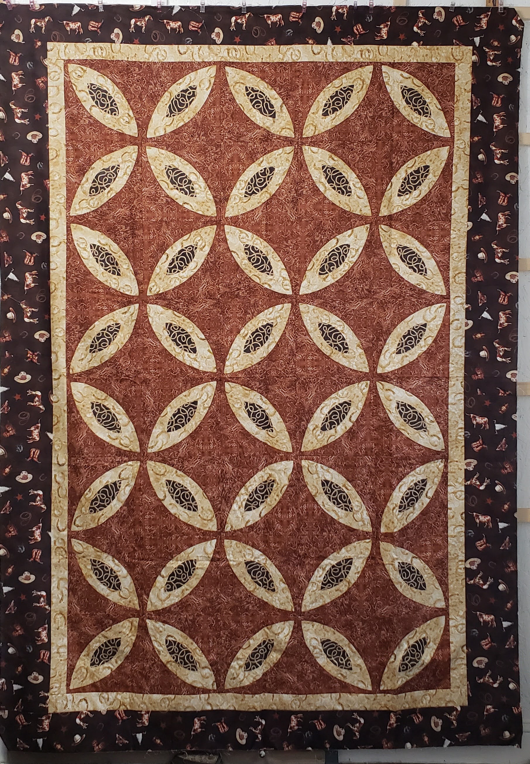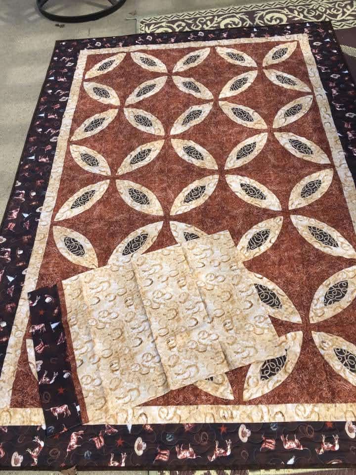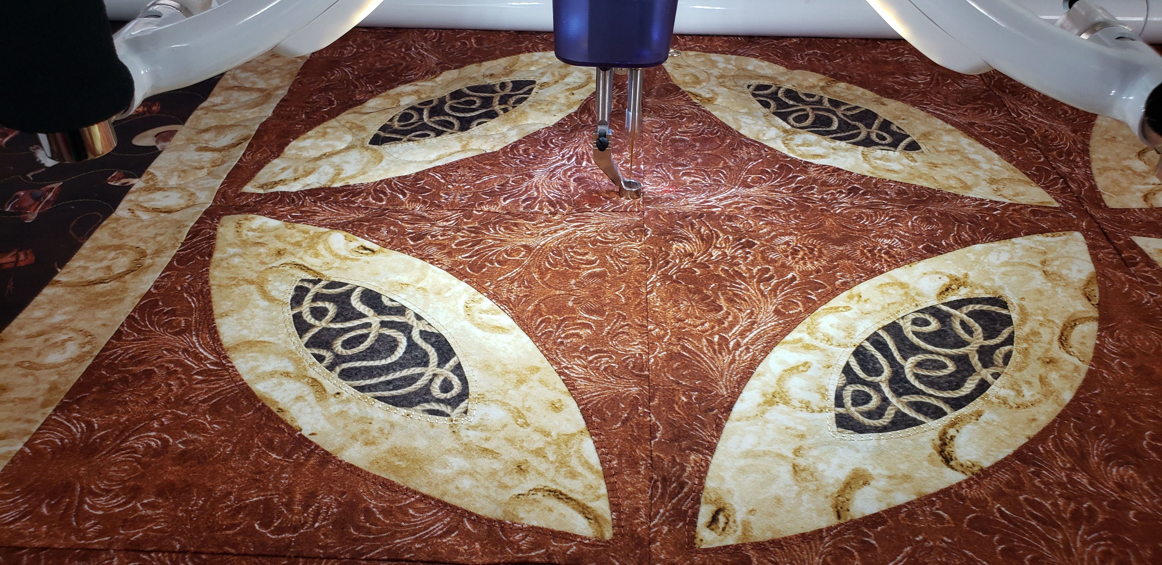 I quilted these with a pantograph that come on my new longarm with Hobbs Batting and Aurifil thread. I purchased the Color Builder set, Florence Brown, that had the perfect brown for the quilt top (6010) and the back was gray fabric, so may go-to Aurifil 2600 Light gray matched.