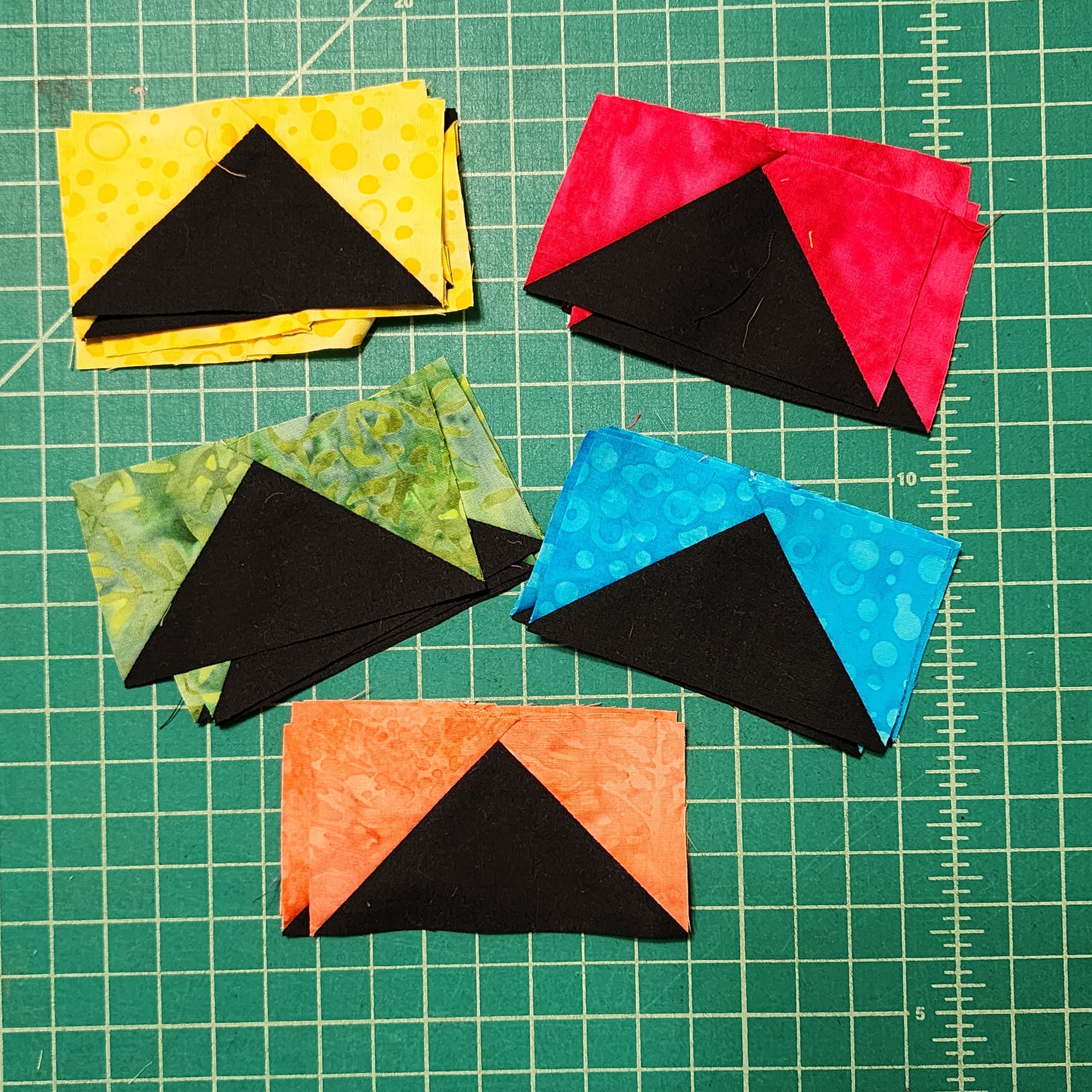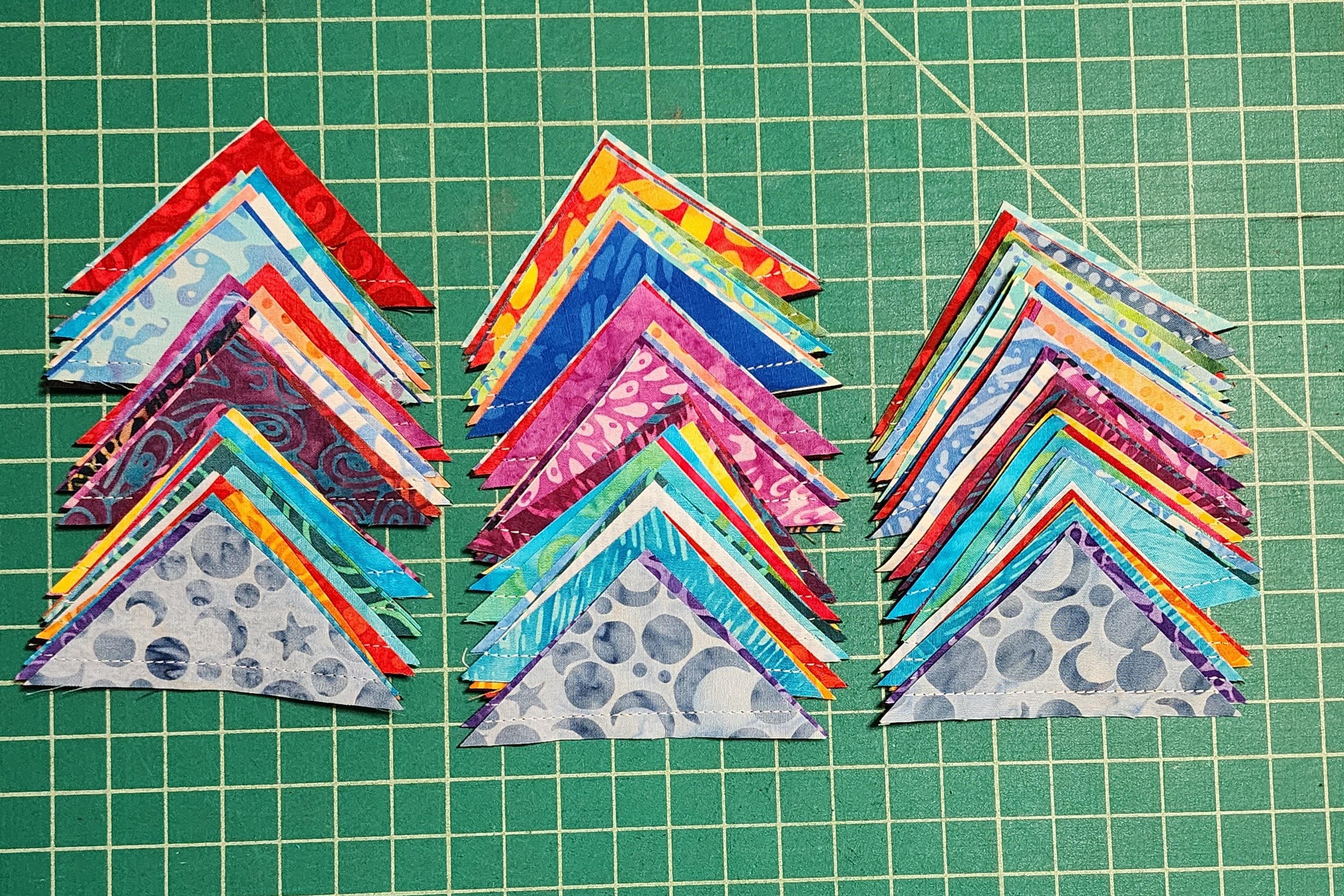 Next, I cut three sets of 33 different triangles from Island Batik fabrics Stash Builders. These were the same fabrics that I used in the July Quilt.