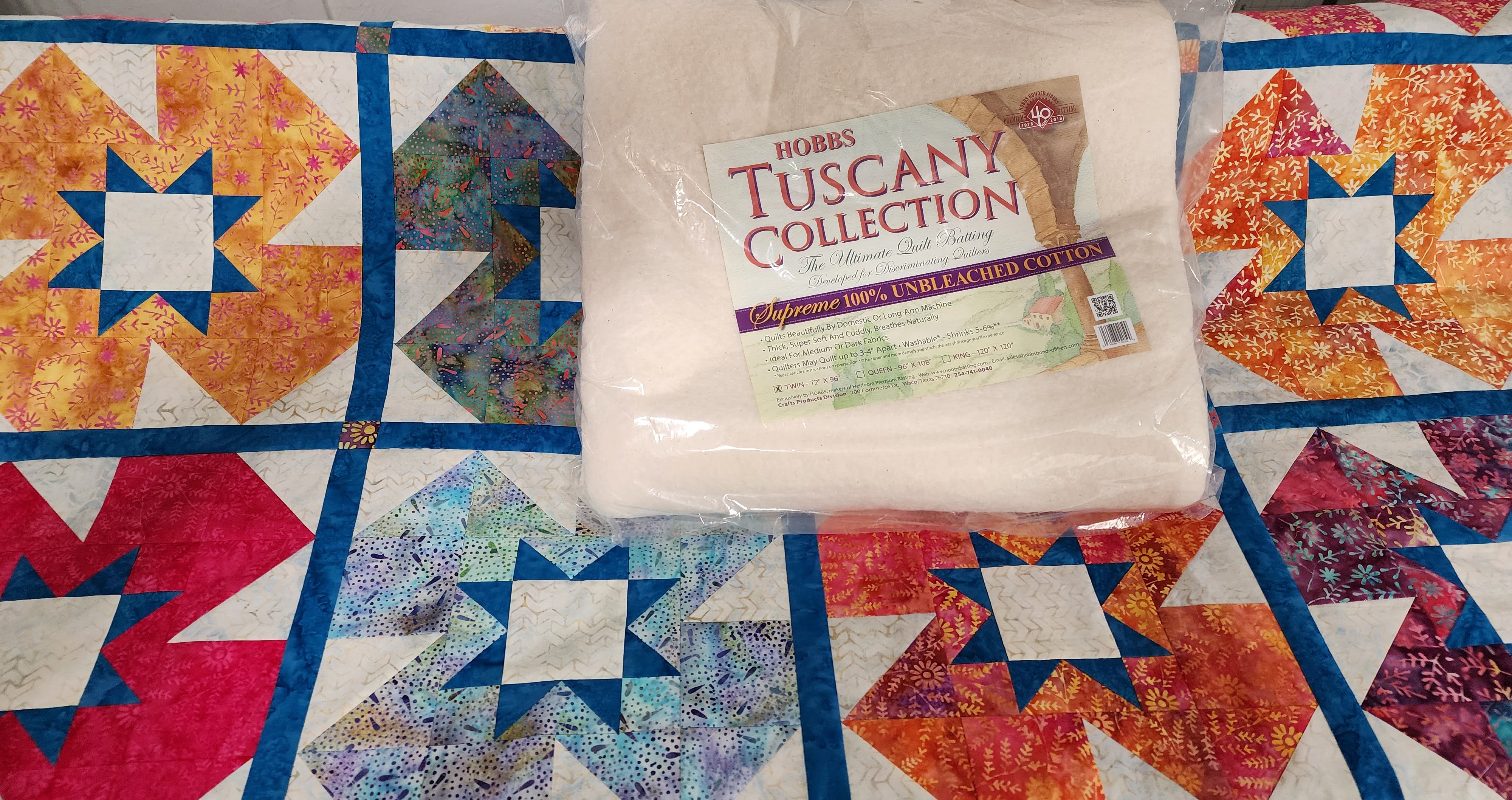 I finished the quilt using Hobbs Batting and Aurifil Thread to quilt. The Hobbs batting is so easy to use. It comes out of the packages very nicely. I used the Tuscany Collection, twin size. This batting quilts beautifully with my long-arm sewing machine. It is a little thicker than some of the other Hobbs batting but breathes Naturally.