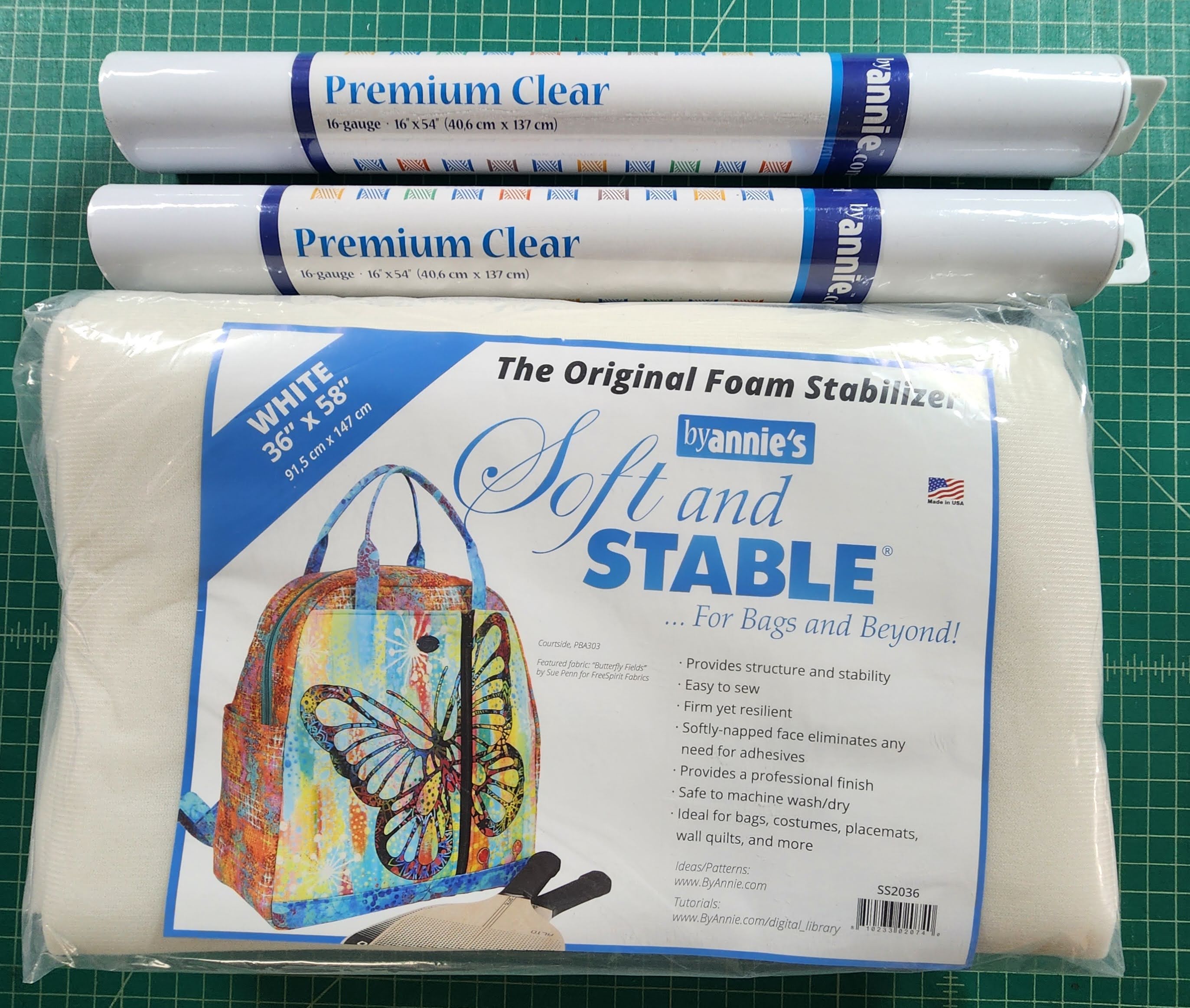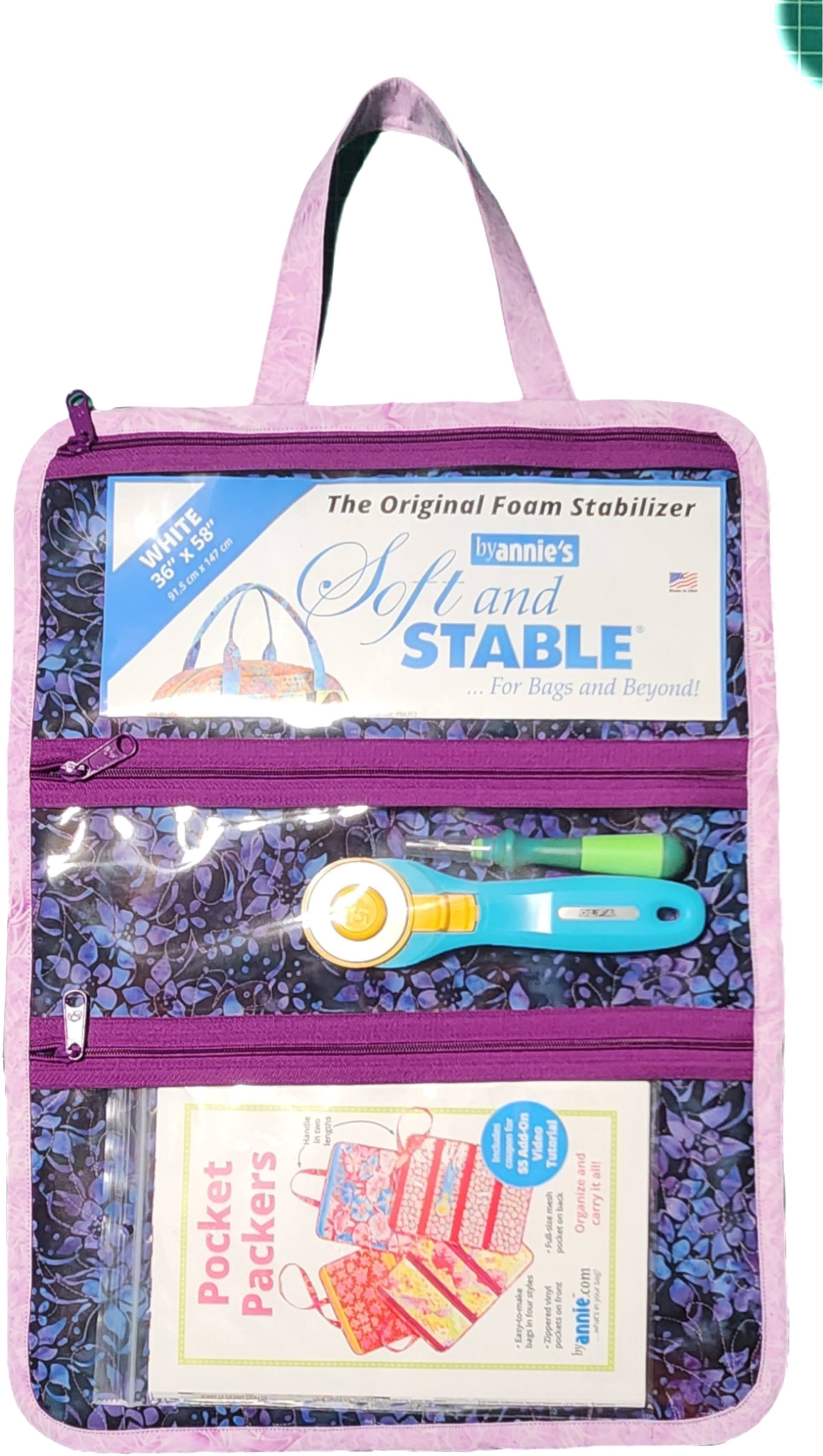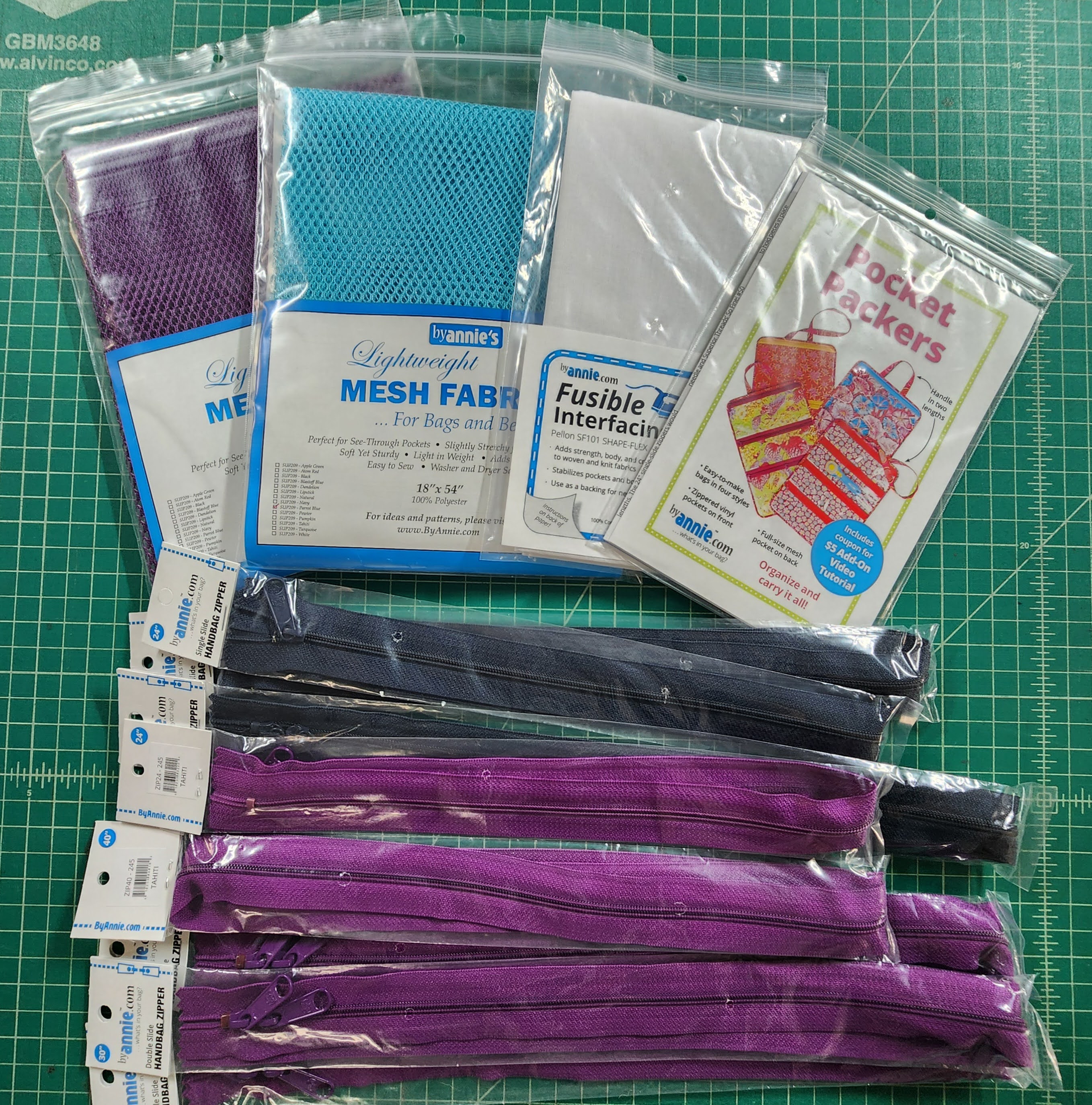 Bags by Annie, sent me the mesh, fabric stabilizer, zippers, vinyl and Soft & Stable. All the items that were needed to make the four bags.