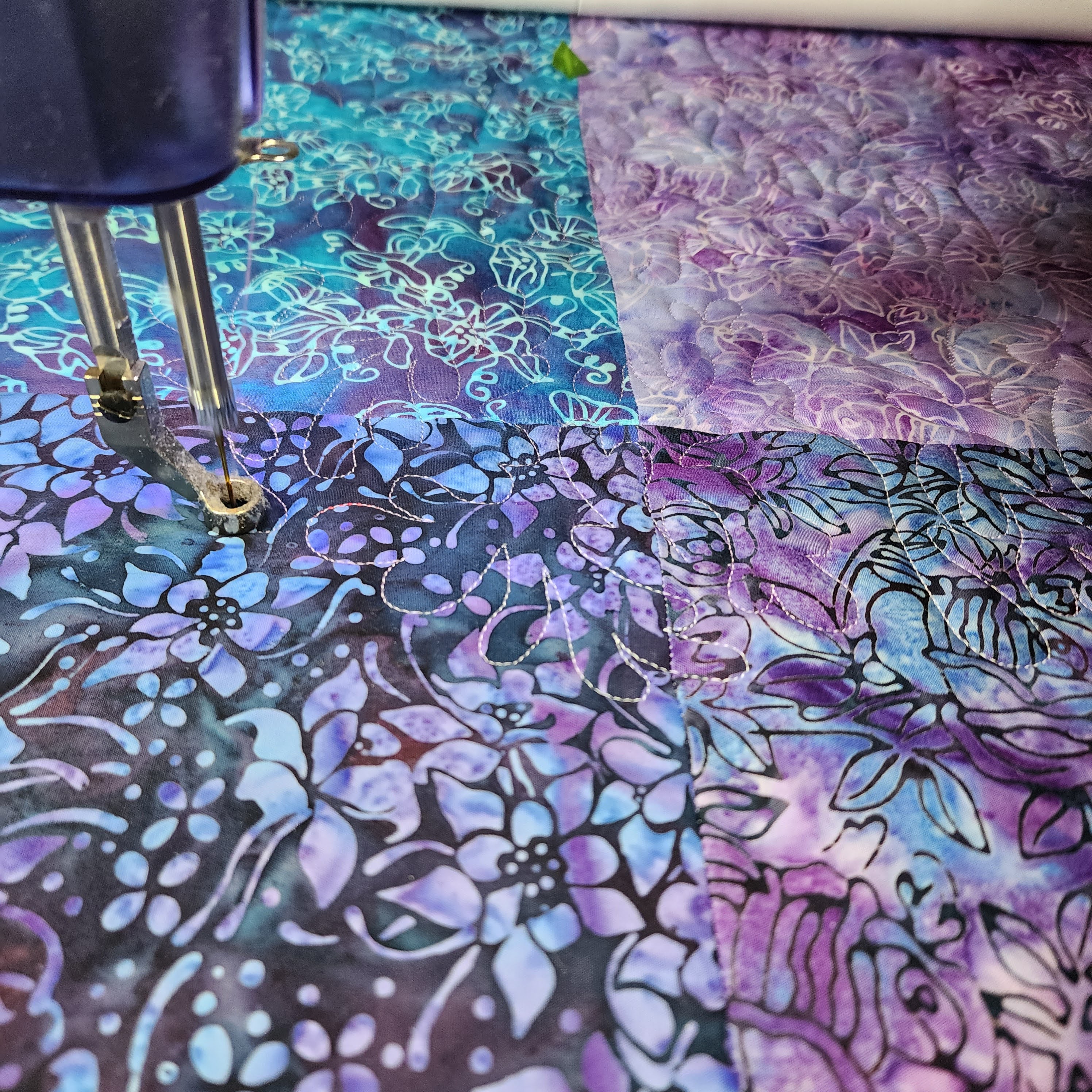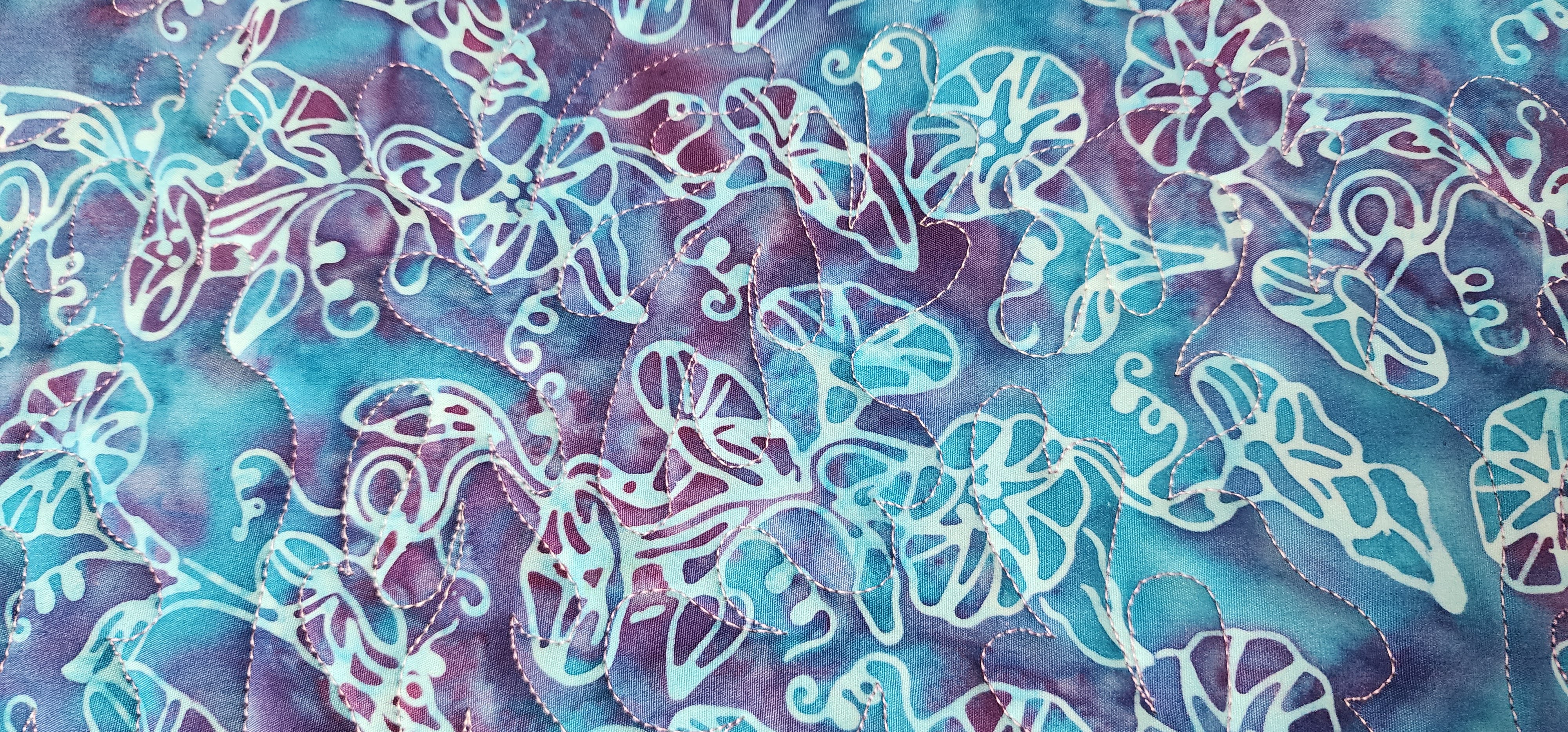 I quilted with some Aurifil Color Builder thread that I had purchased, called Hawaiian Blue Ginger. There was a variegated thread that matched most of the fabric.