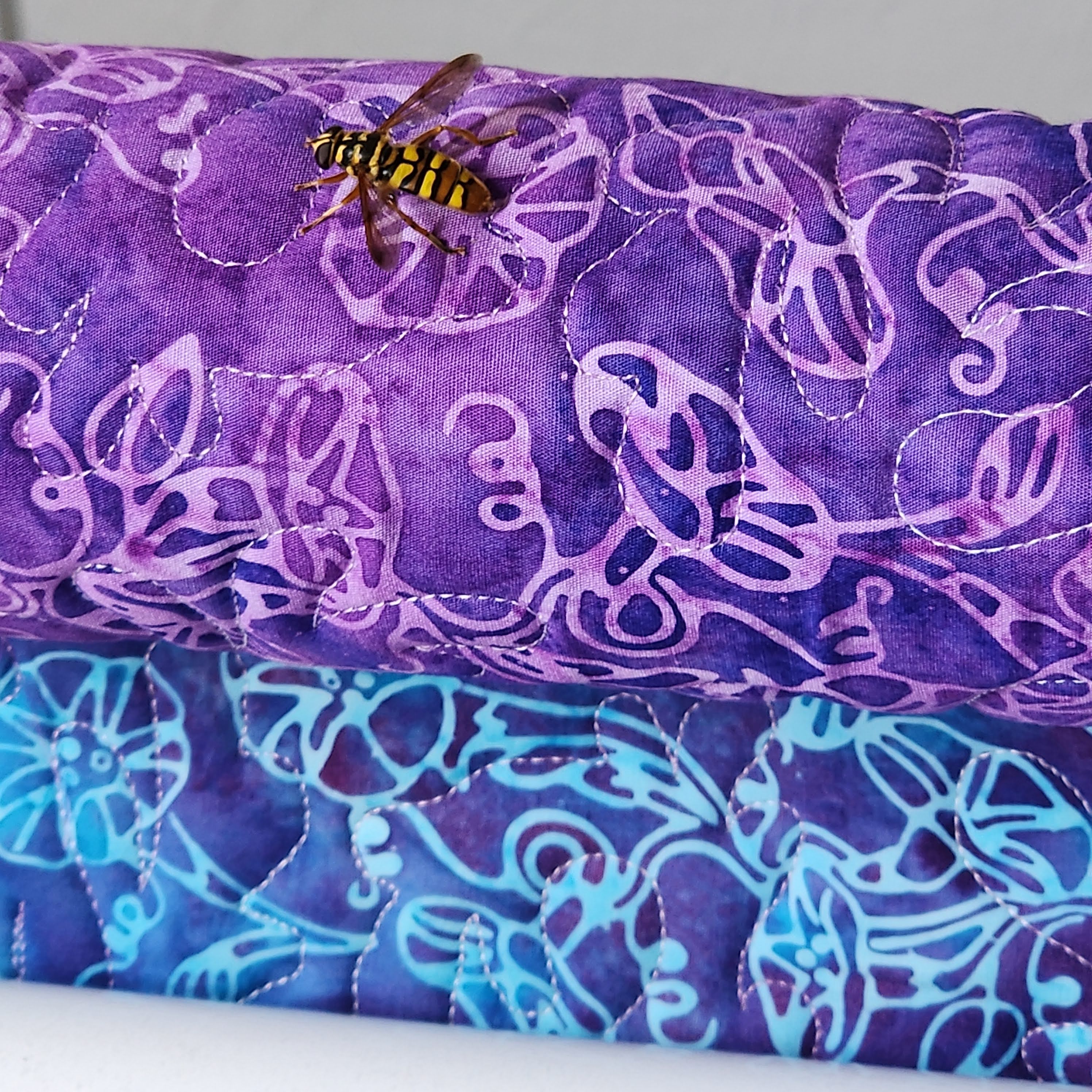 While I was quilting the fabric, I had a little visitor. One of my husband’s bee’s decided to come see what I was doing. He left after a little while, before it was time to roll up the fabric for the next section.