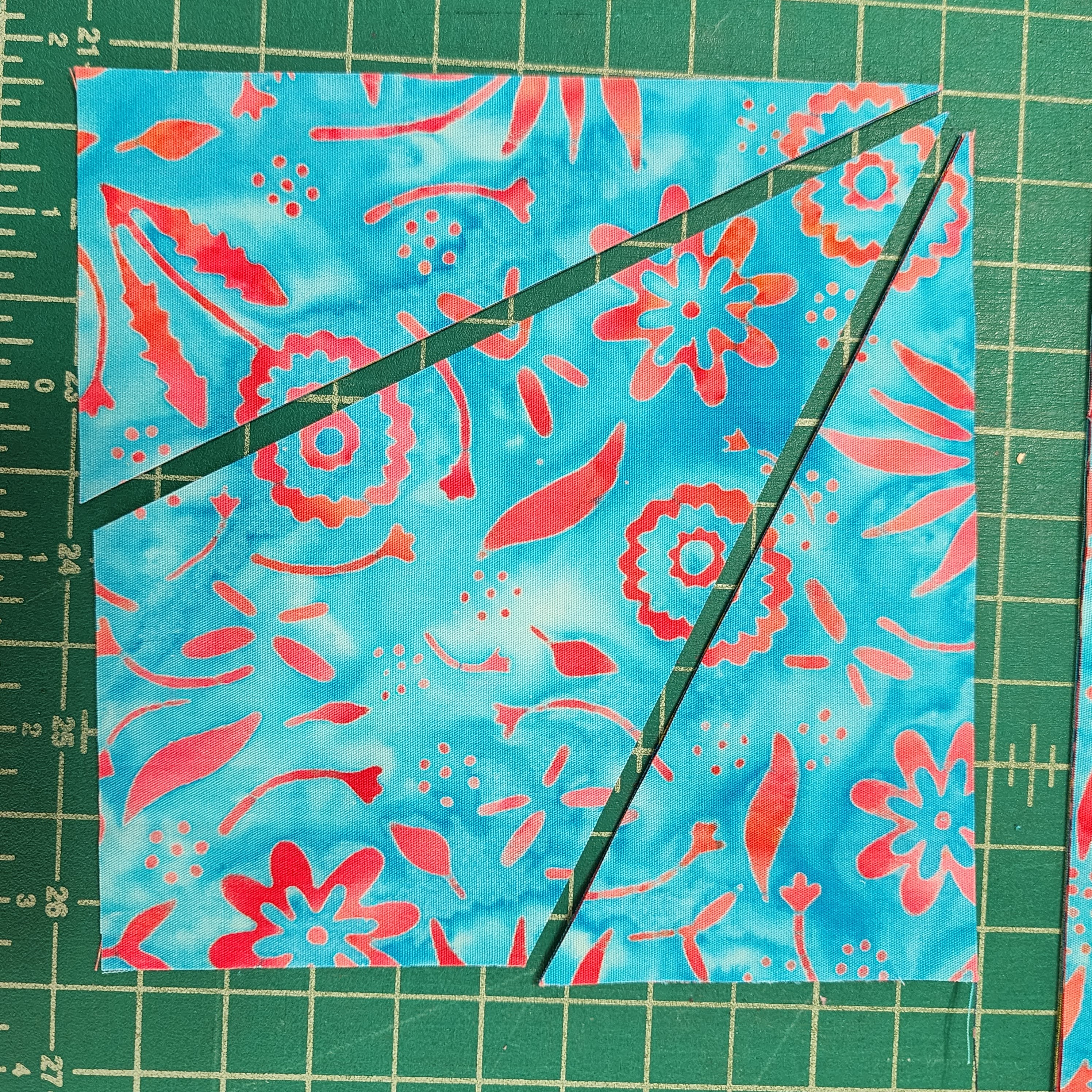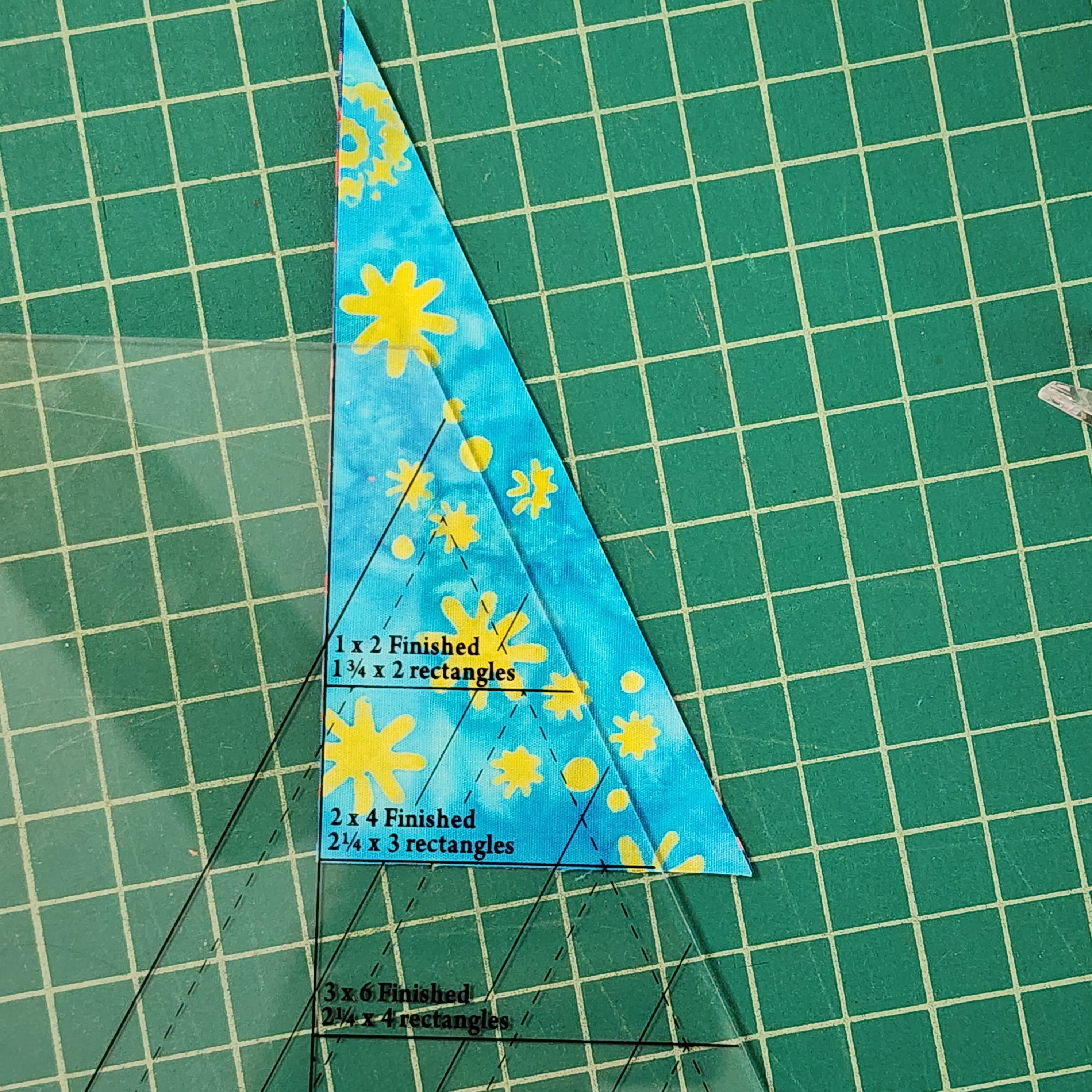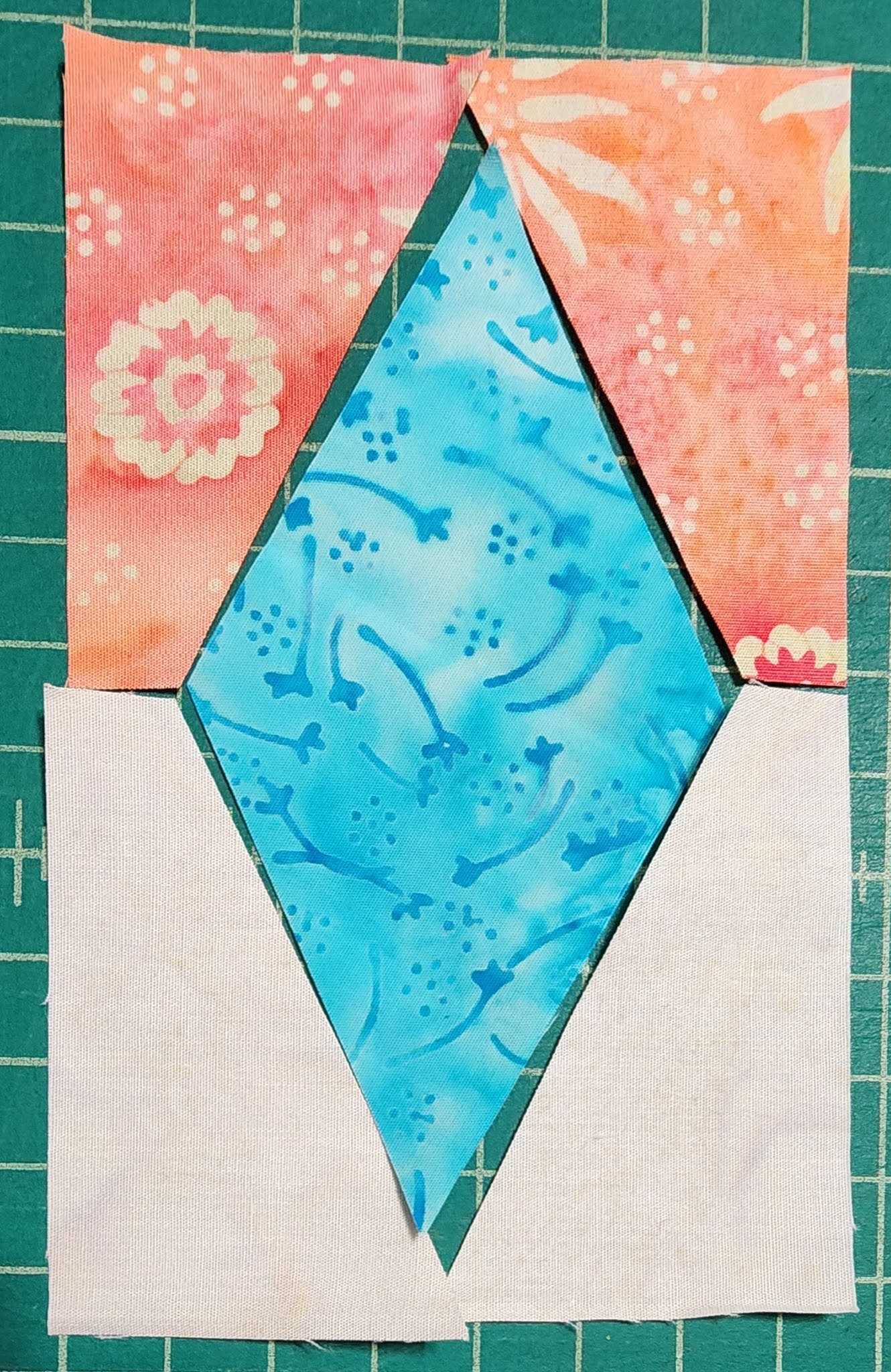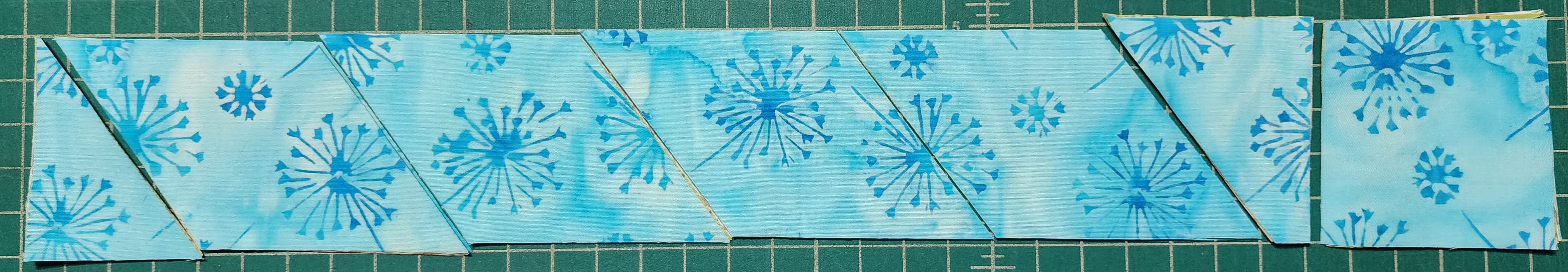 Using the Diamond Rect’ ruler, you cut out the Diamond shaped pieces. This can be done in one long strip of fabric. The end of the strip is the square that is needed for the center.