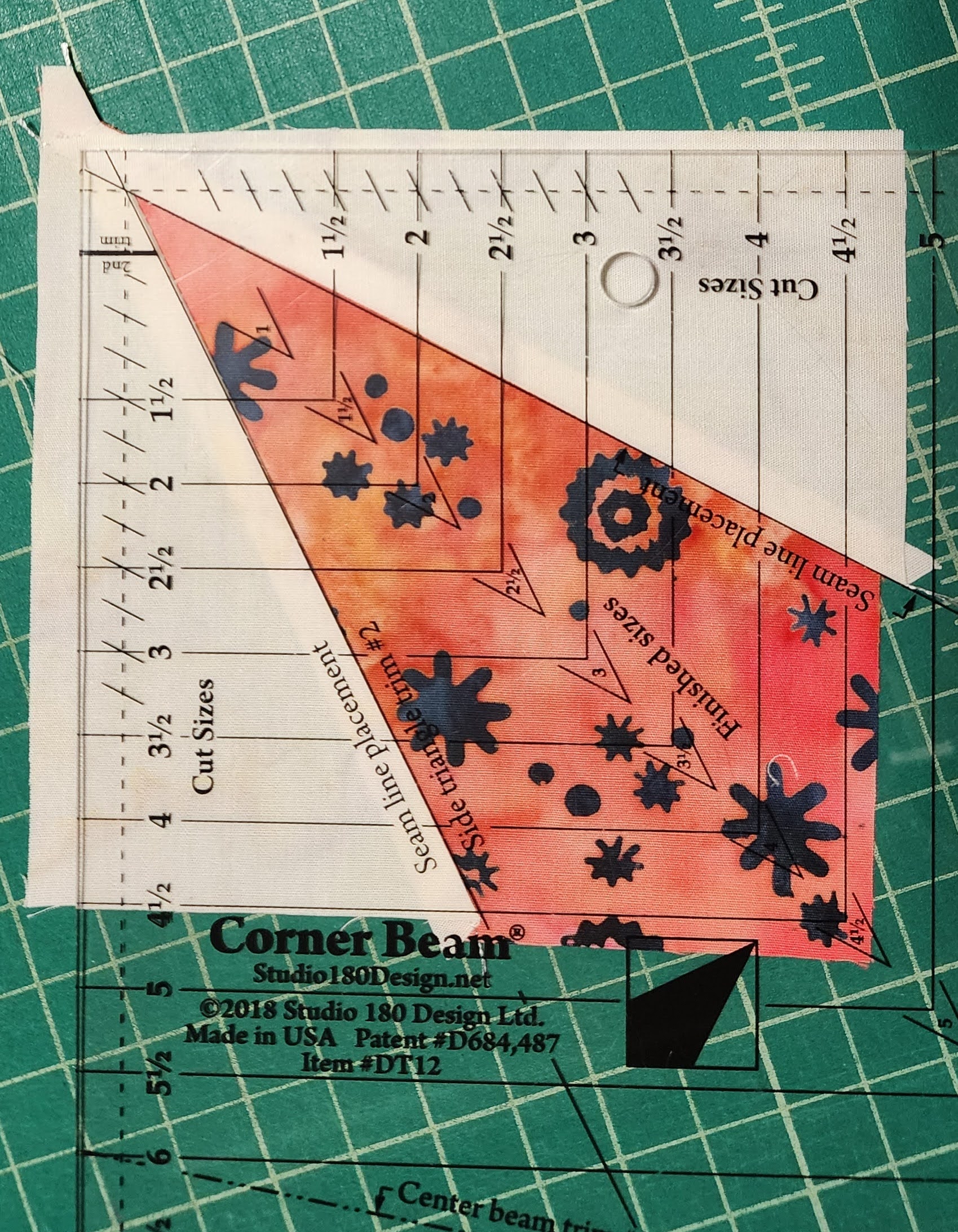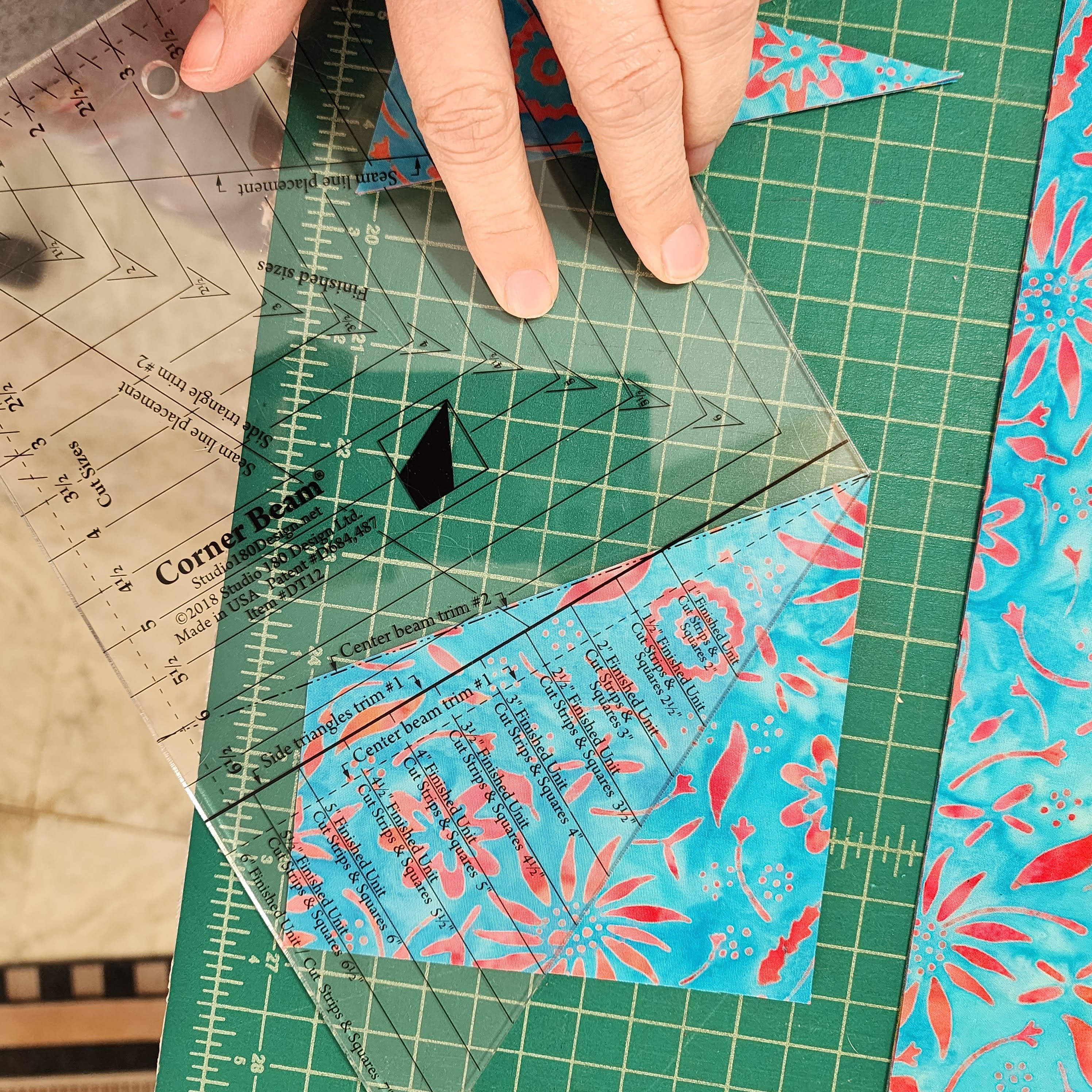 Sewing one side on, pressing, sewing the other size. Then using the Corner Beam Ruler, trimmed the piece. There are lines to place along your seams in this picture. You can trim two sides.