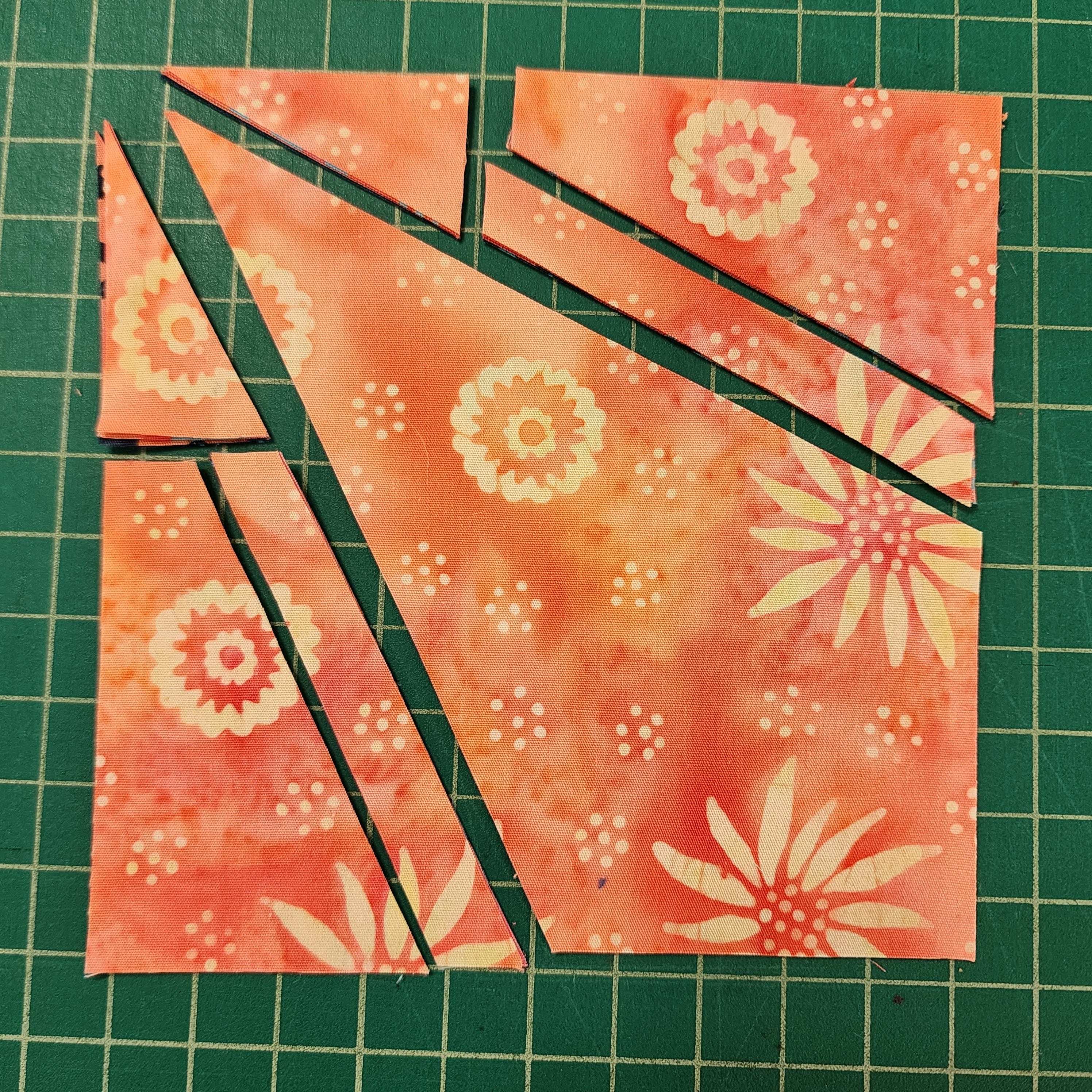 I sorted the Just Dandy fabric into two groups for the block. Making sure that there was contrast in the fabric line. The darker fabrics (left side) will be the Corner Beams. The lighter fabrics will be used to create the Diamond Rects along with some of the darker fabrics.