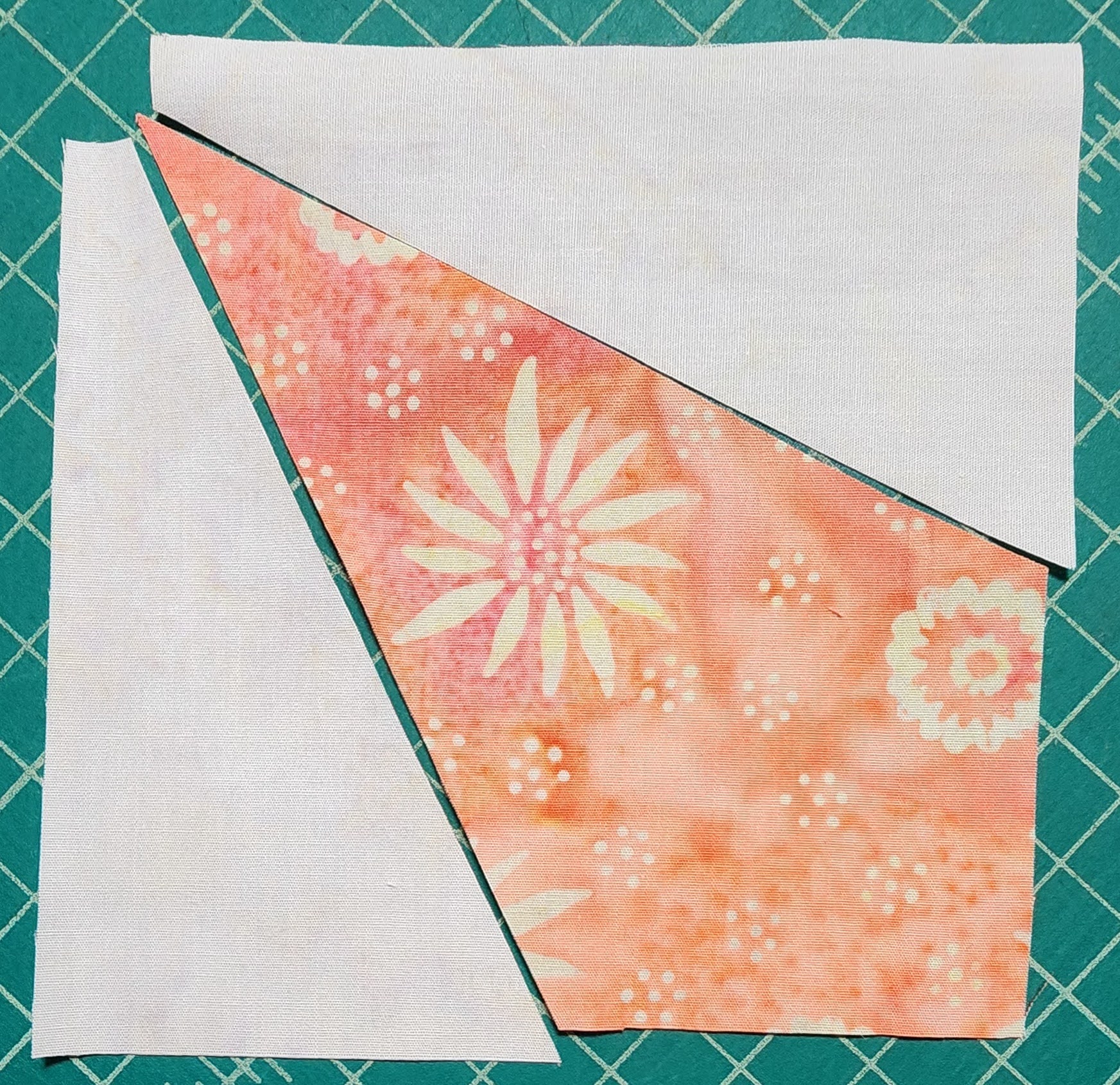 You sew one white and one color fabric – diagonally across. Then press and sew the other two pieces.