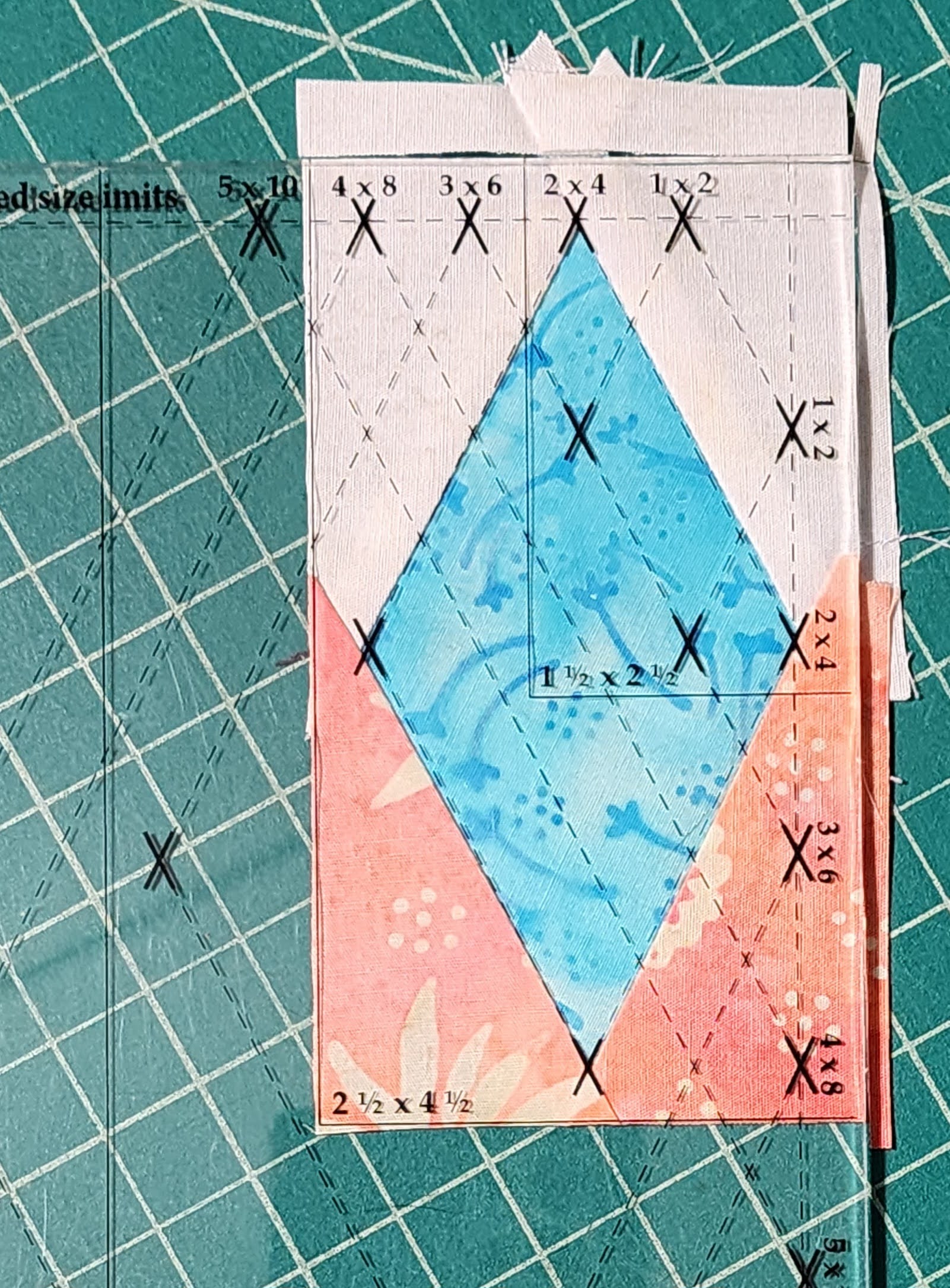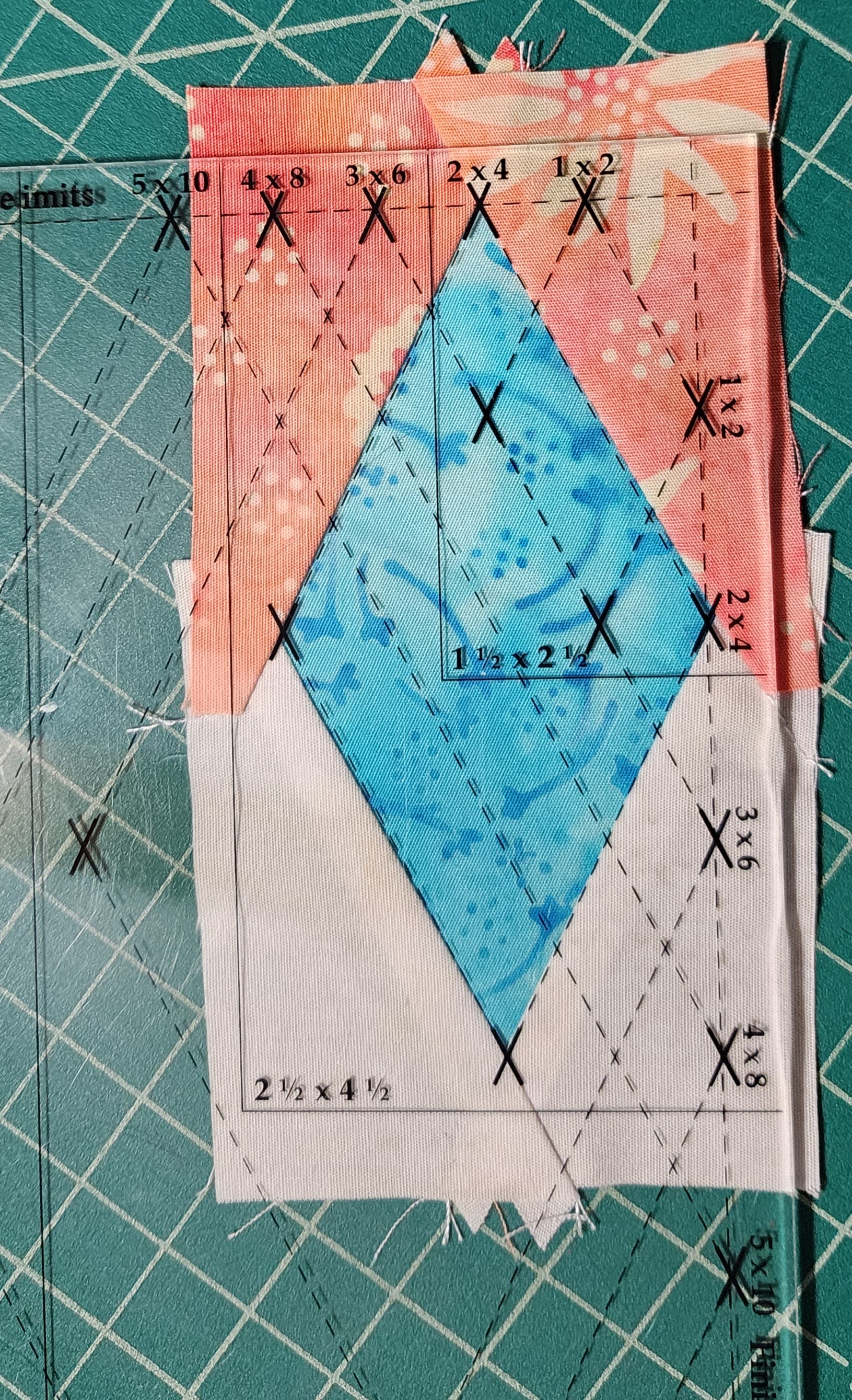 Using the Diamond Rect’ ruler, you center the top point into the 2×4 “X”. Match the other three points with the X marks. This keeps the block centered. Trim the two sides.