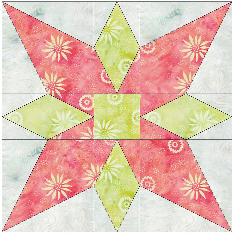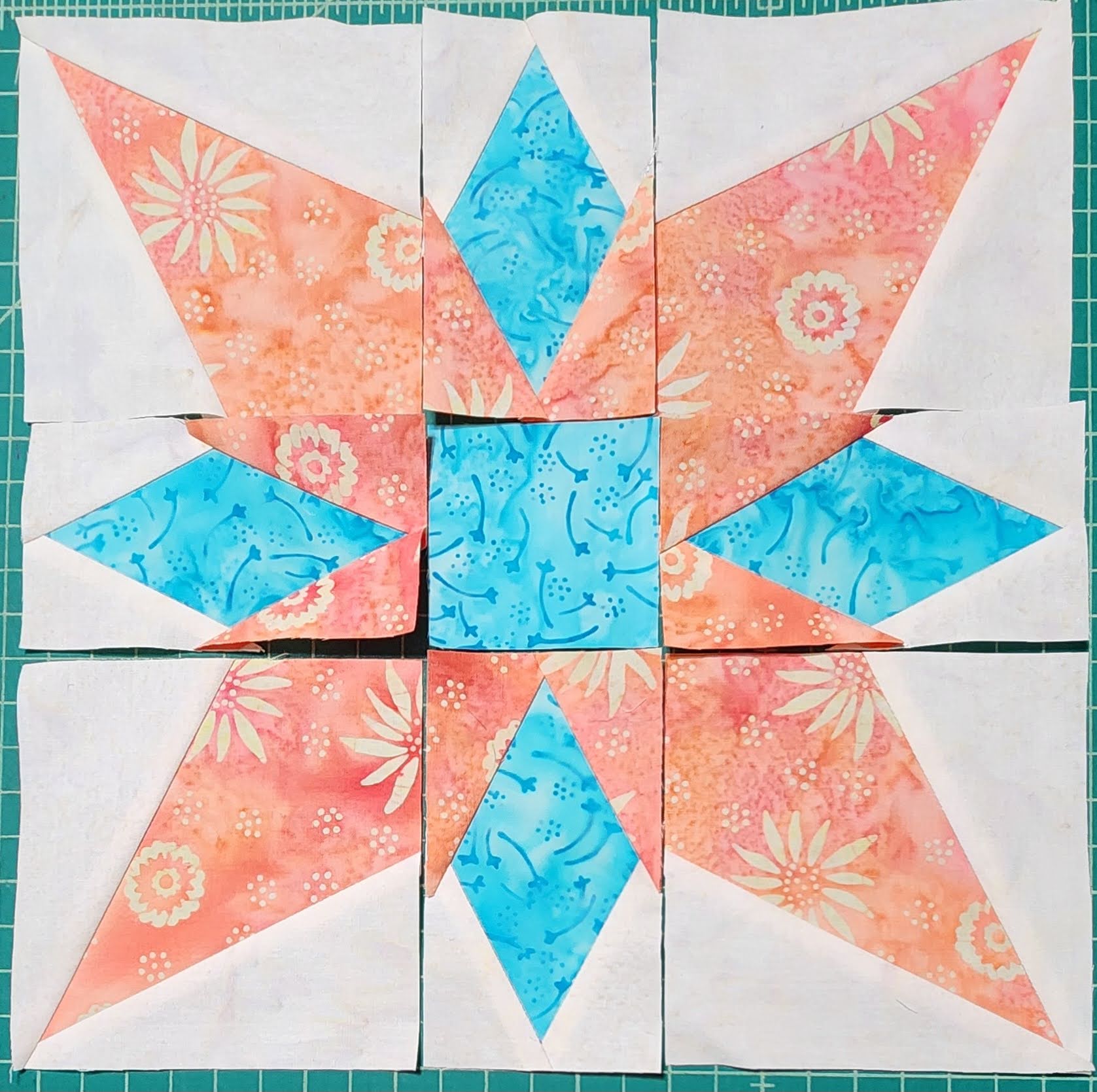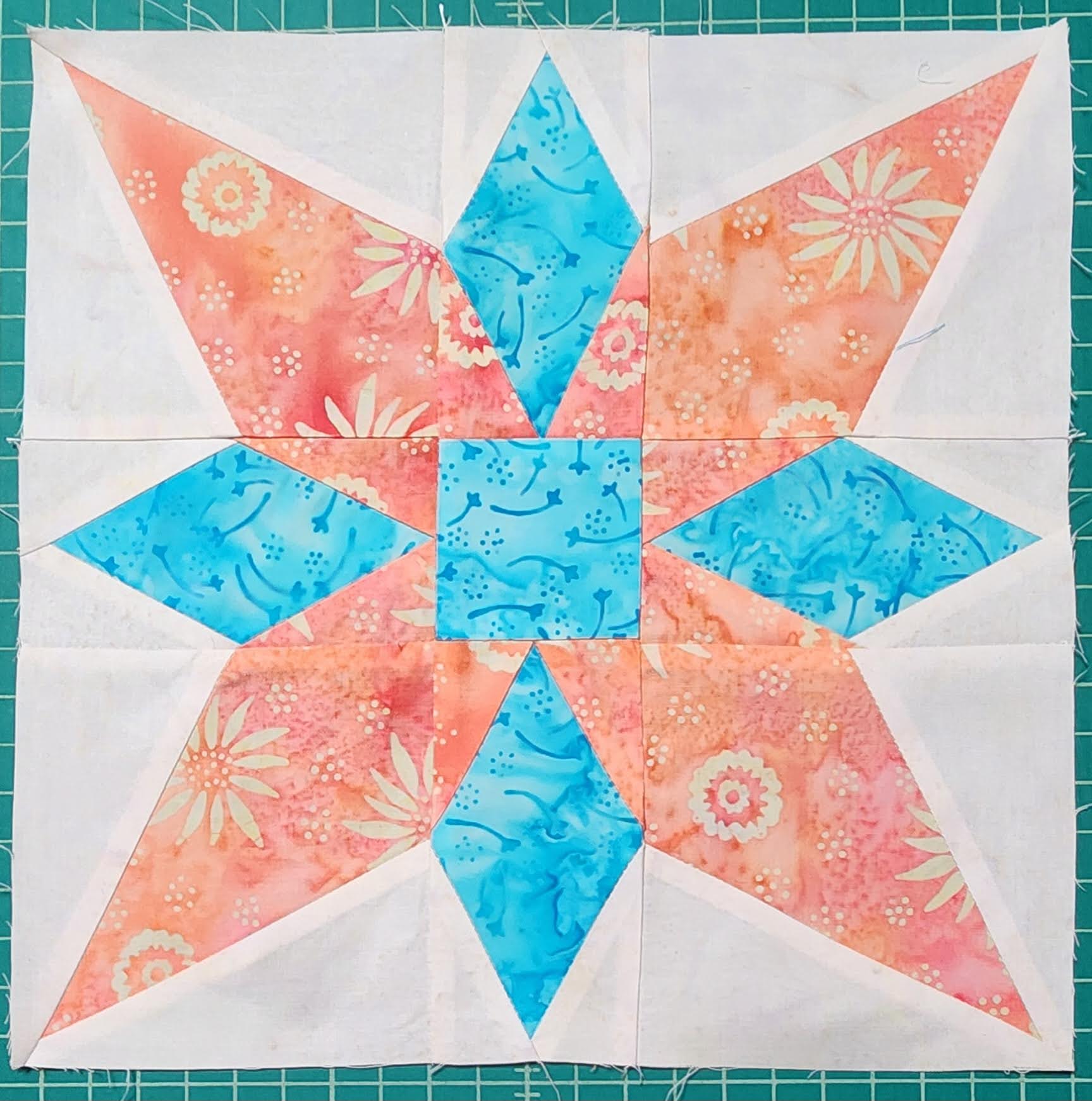 I decided to create a star using the two rules. Each block would finish at 10″ square. The 4 corners include the “Corner Beam” block, which finishes at 4″ x 4″. The “Diamond Rects” blocks finish at 2″ x 4″. With a 2 1/2″ square in the center.