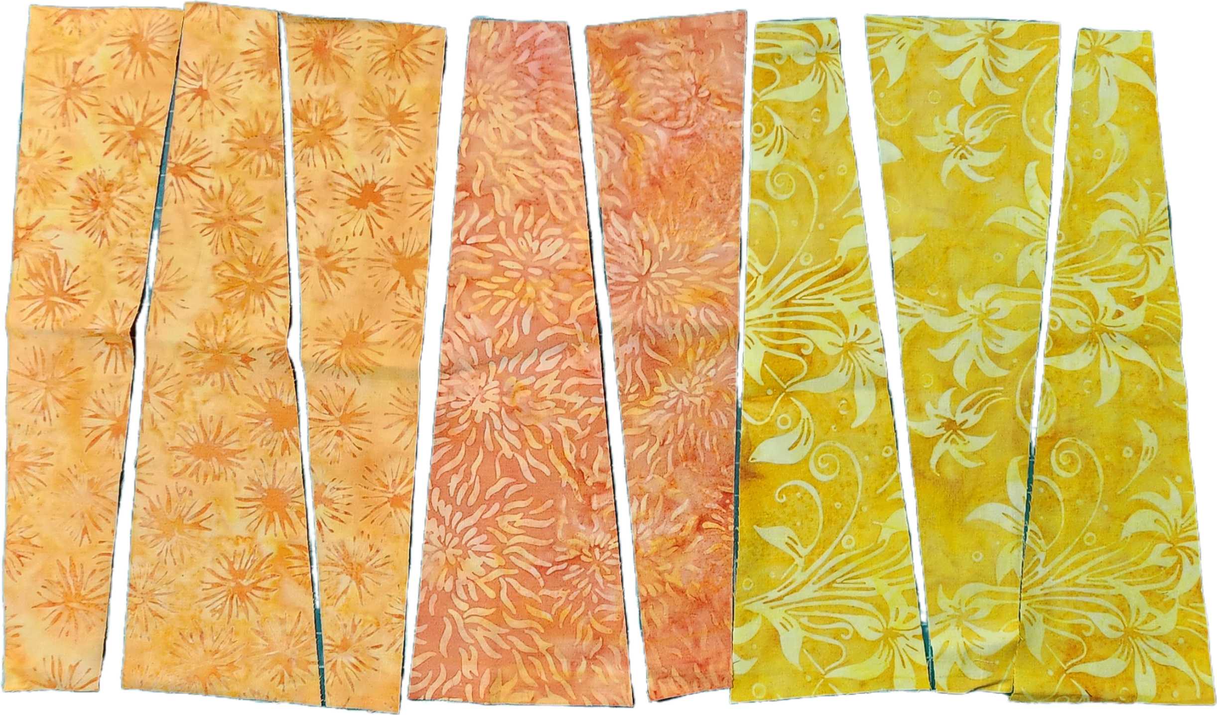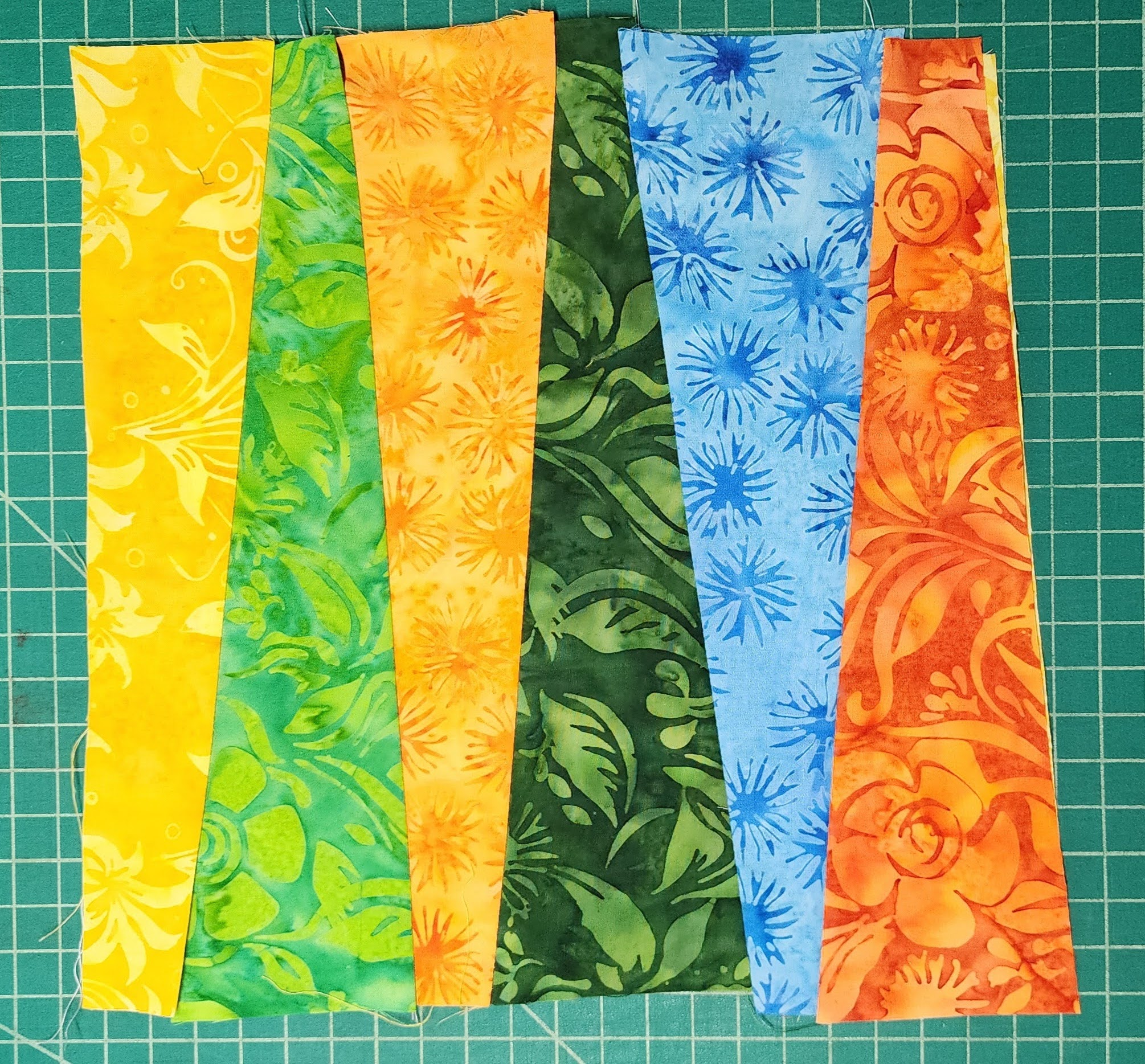 To start, I cut fabric strips slightly larger than the intended block size, then sliced them into random, angled pieces. I prepared pieces from all the fabrics I wanted in my quilt. I also set aside some larger cuts for diagonal blocks.