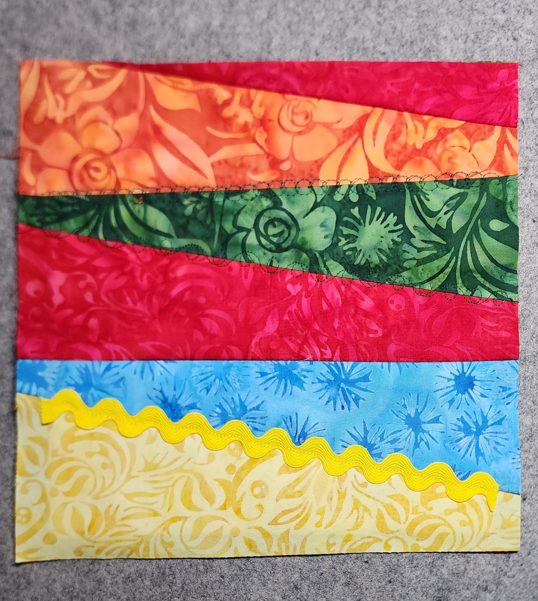 Once fused, I layered various fabrics onto the background until fully covered. Stitching right-sides together, then pressing out. (Watch the batting if you use an Iron it is fusible batting).