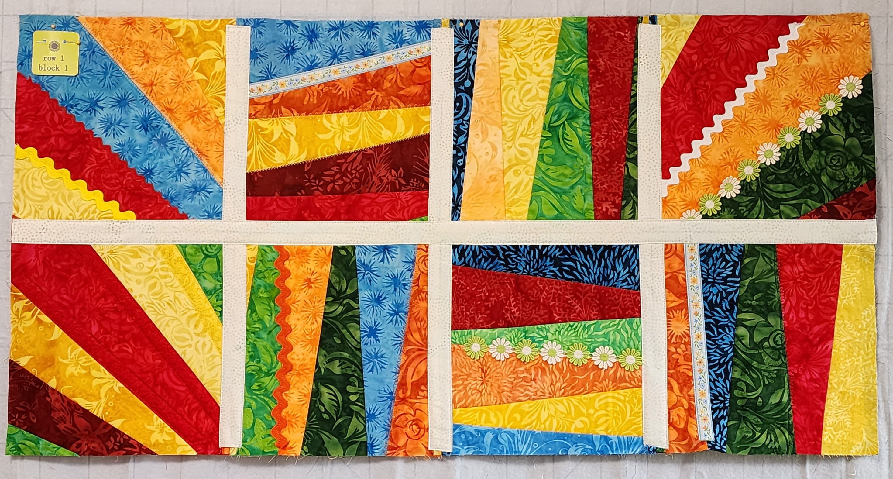 Rows were joined two at a time, sashing between the rows until all 5 rows were connected.