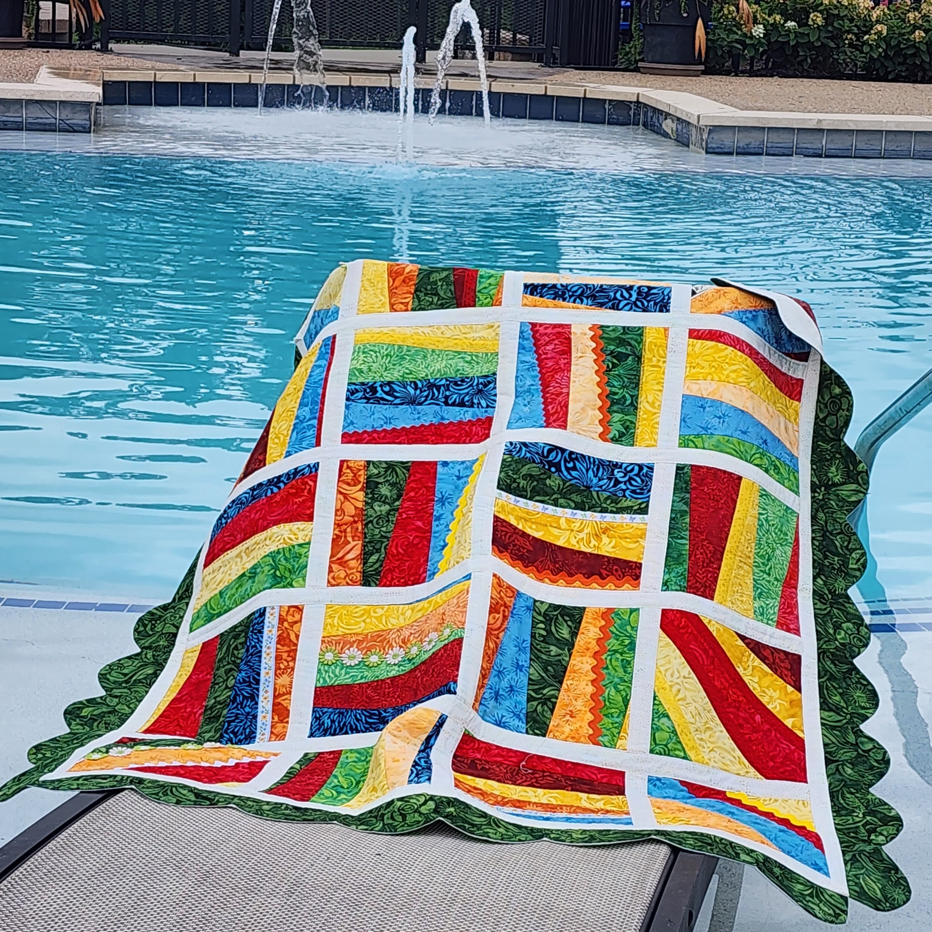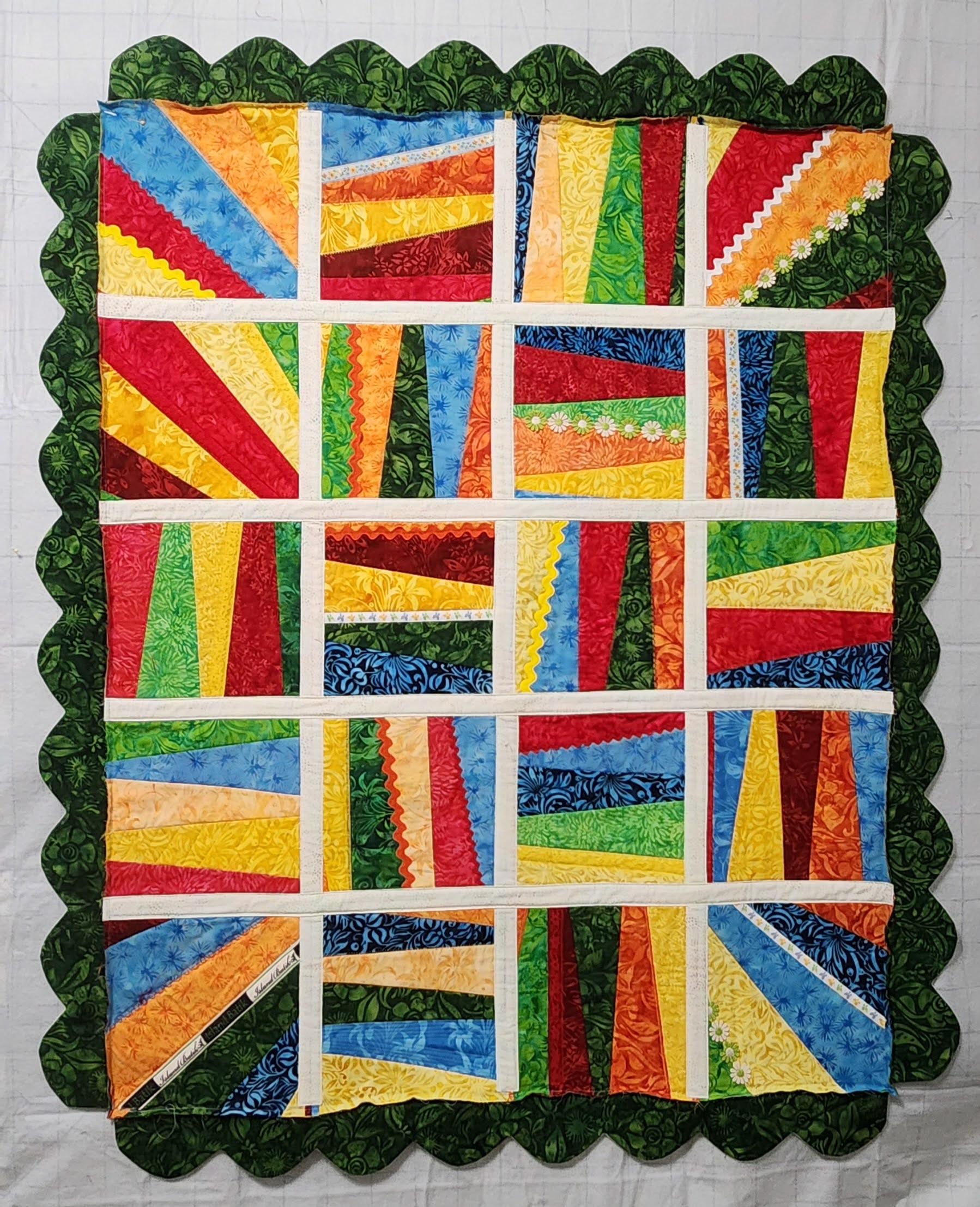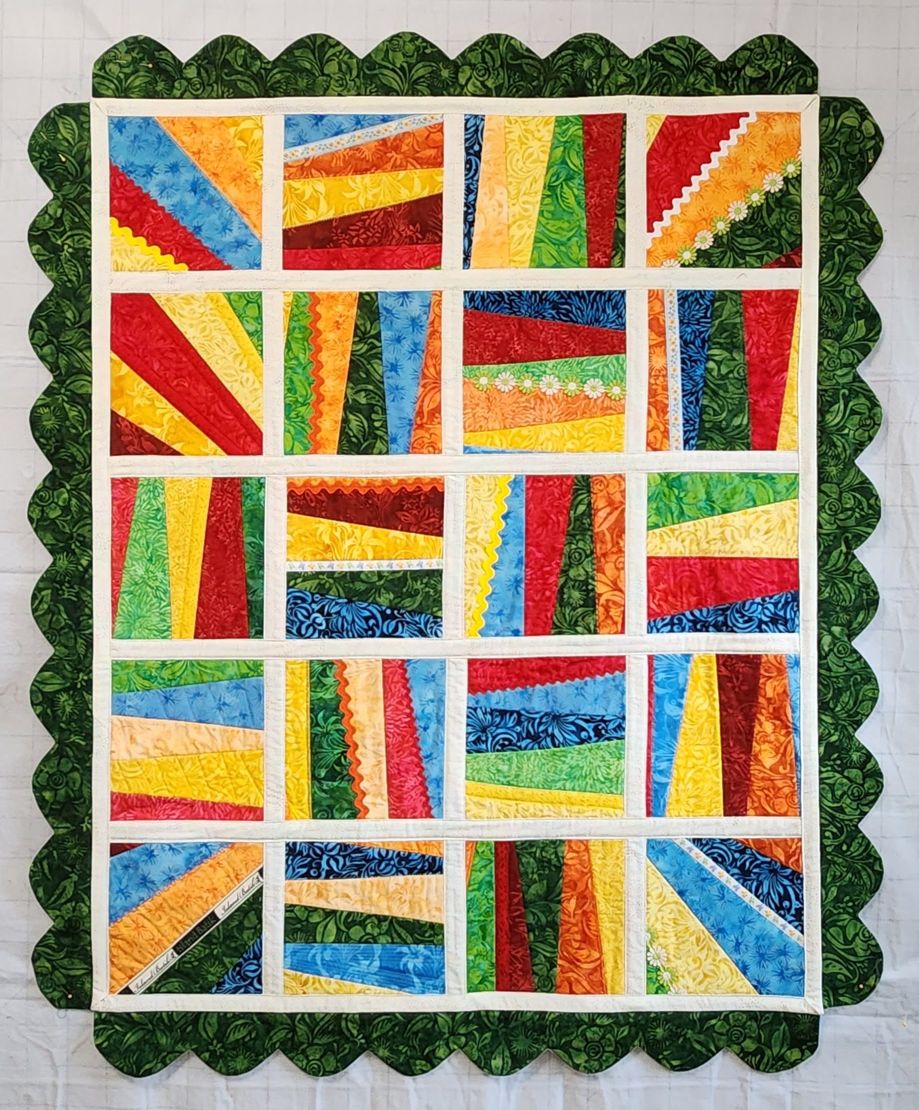 What a fun quilt! I love the trims you used, especially the Island Batik ribbon. It was interesting to learn how you constructed this project. Happy sewing!