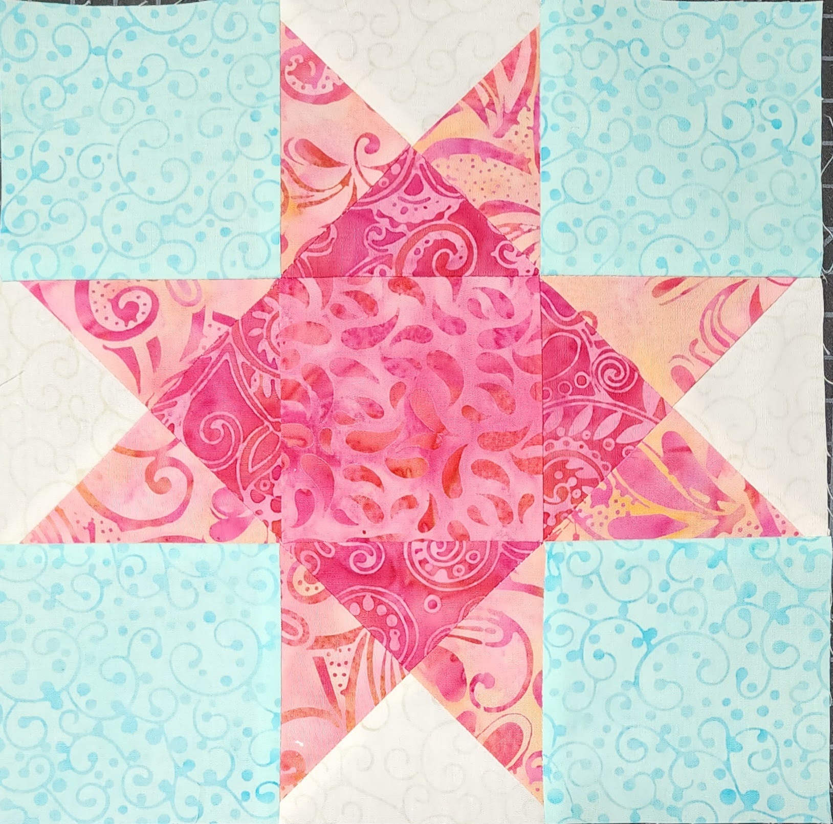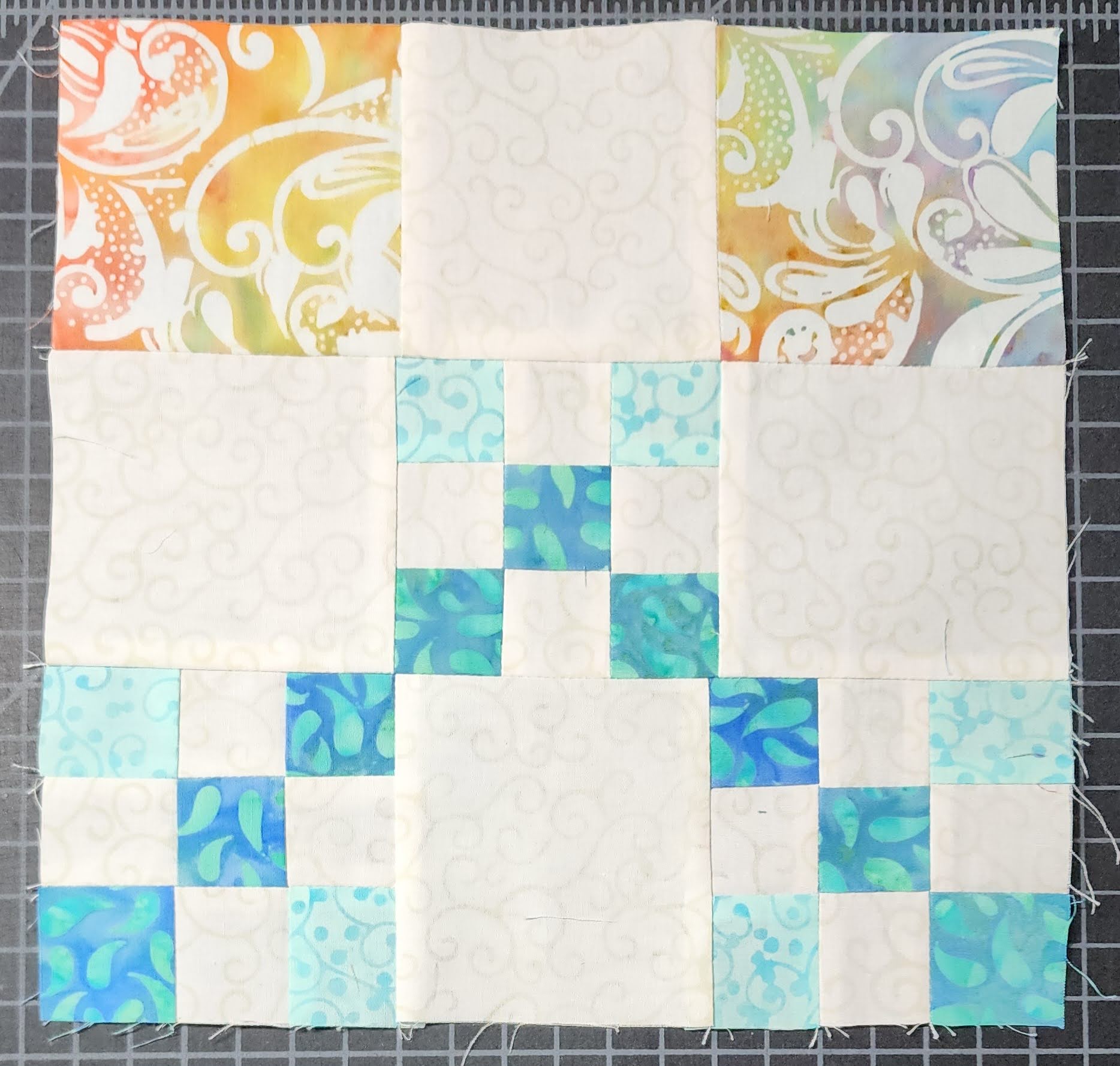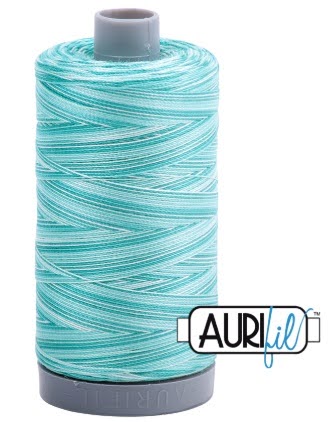 I love quilting with variegated thread. The Aurifil Turquoise Foam variegated thread blended well with the fabrics.