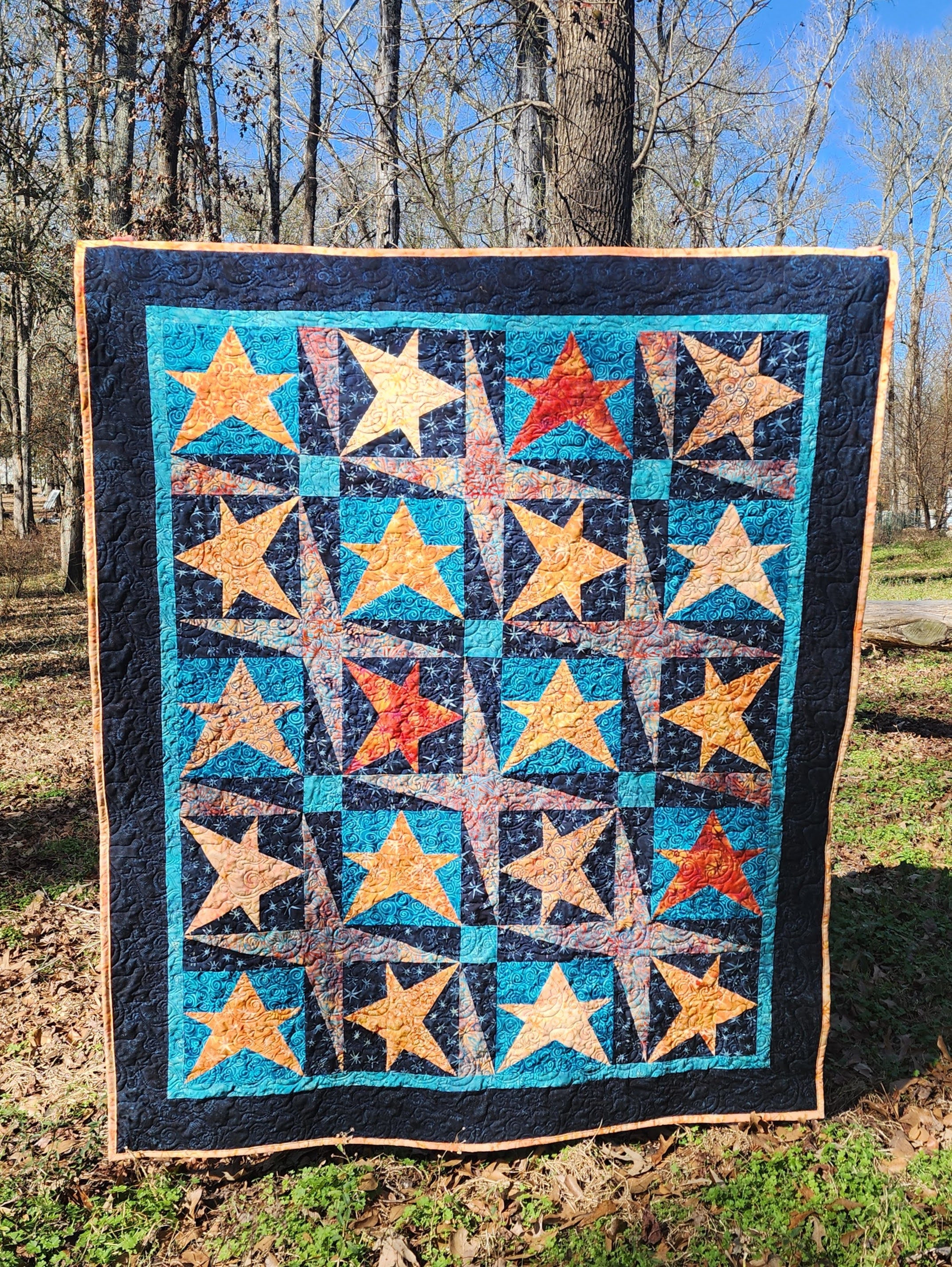 The binding featured lighter fabric from the stars, tying the whole quilt together. Here is my completed Starry Night quilt, which finished at 50” x 60”.